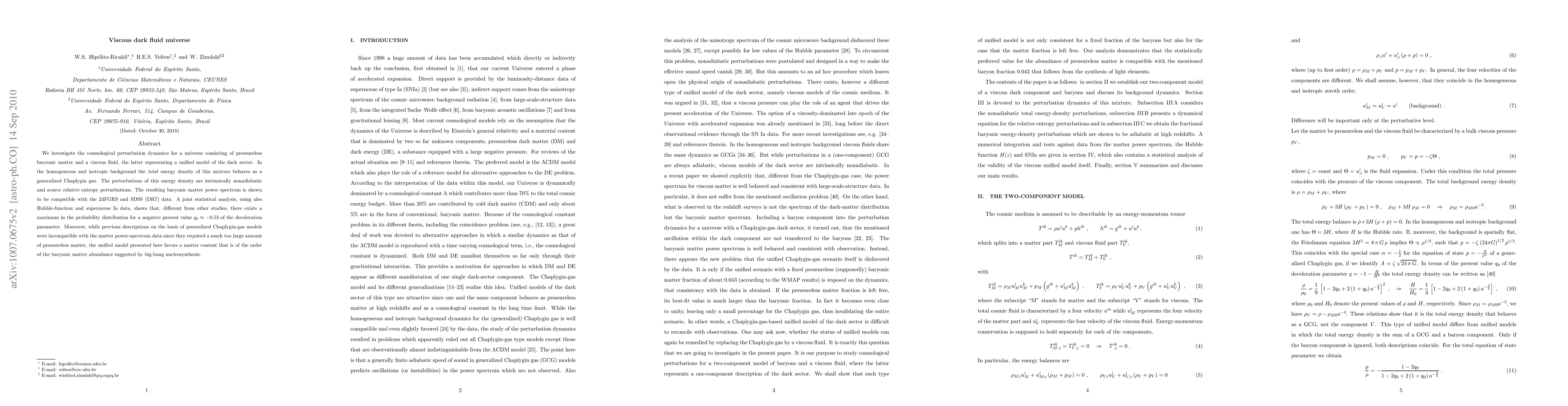 This paper explores a cosmological model with a viscous dark fluid and pressureless baryonic matter, showing that the perturbations in this mixture generate non-adiabatic entropy perturbations. The model's predictions align well with observational data, indicating a maximum probability for a negative deceleration parameter, and suggests a matter content consistent with big-bang nucleosynthesis.