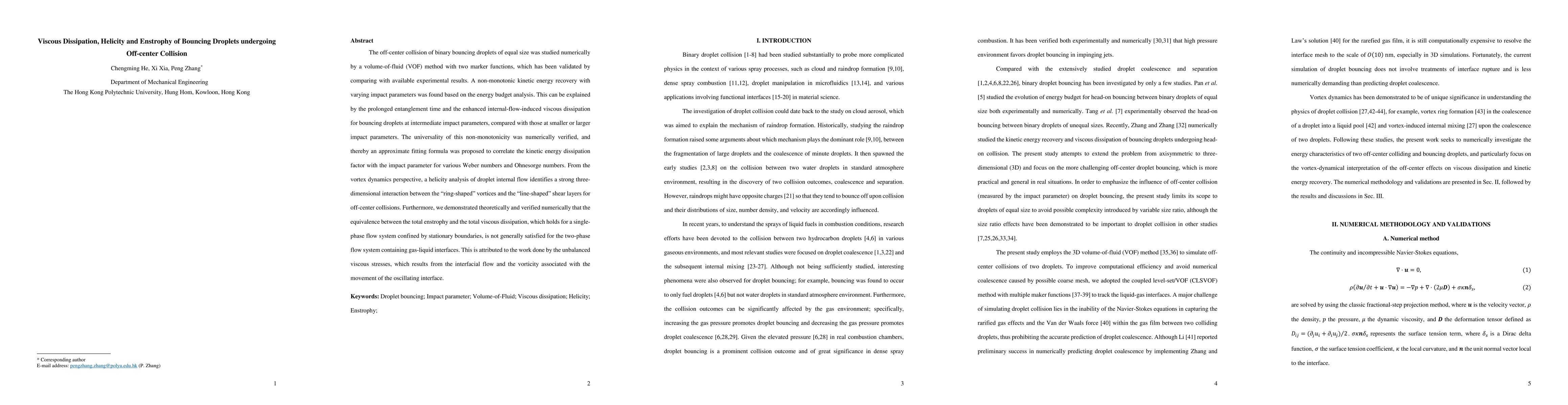 The off-center collision of binary bouncing droplets of equal size was studied numerically by a volume-of-fluid (VOF) method with two marker functions, which has been validated by comparing with available experimental results. A non-monotonic kinetic energy recovery with varying impact parameters was found based on the energy budget analysis. This can be explained by the prolonged entanglement time and the enhanced internal-flow-induced viscous dissipation for bouncing droplets at intermediate impact parameters, compared with those at smaller or larger impact parameters. The universality of this non-monotonicity was numerically verified, and thereby an approximate fitting formula was proposed to correlate the kinetic energy dissipation factor with the impact parameter for various Weber numbers and Ohnesorge numbers. From the vortex dynamics perspective, a helicity analysis of droplet internal flow identifies a strong three-dimensional interaction between the "ring-shaped" vortices and the "line-shaped" shear layers for off-center collisions. Furthermore, we demonstrated theoretically and verified numerically that the equivalence between the total enstrophy and the total viscous dissipation, which holds for a single-phase flow system confined by stationary boundaries, is not generally satisfied for the two-phase flow system containing gas-liquid interfaces. This is attributed to the work done by the unbalanced viscous stresses, which results from the interfacial flow and the vorticity associated with the movement of the oscillating interface.