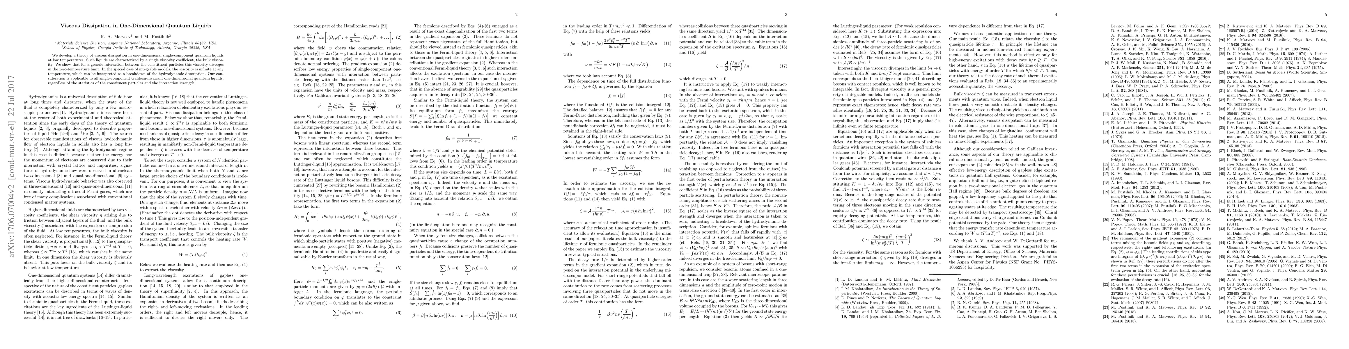 This paper develops a theory for viscous dissipation in one-dimensional quantum liquids, showing that bulk viscosity diverges at zero temperature for generic interactions. In integrable models, the viscosity is infinite at all temperatures, indicating a failure of hydrodynamic descriptions.