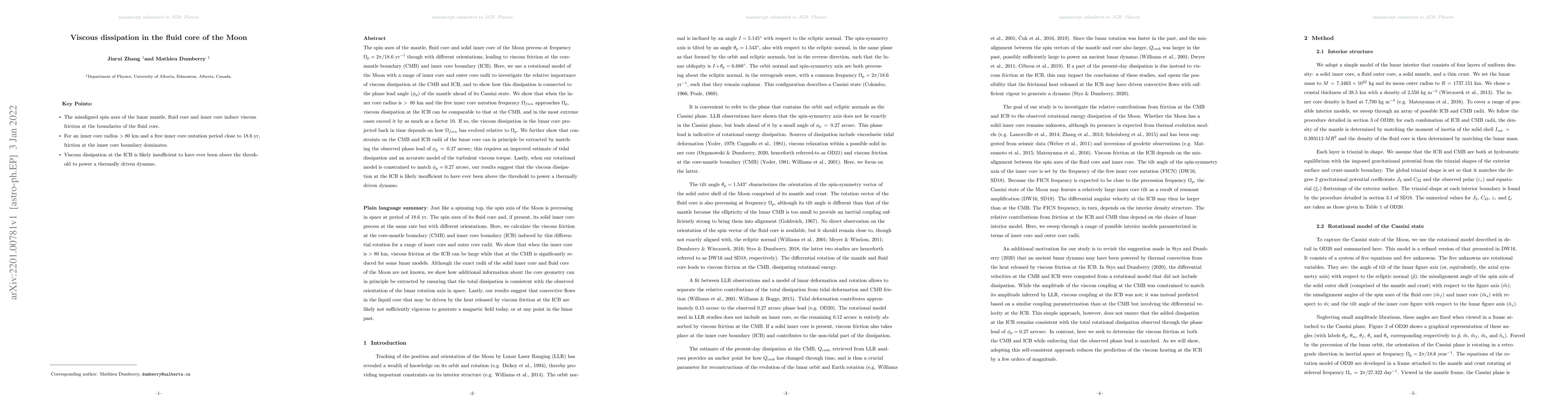 The paper presents a detailed rotational model of the Moon's core and mantle, analyzing viscous dissipation at the CMB and ICB in relation to the phase lead angle $\phi_p$.