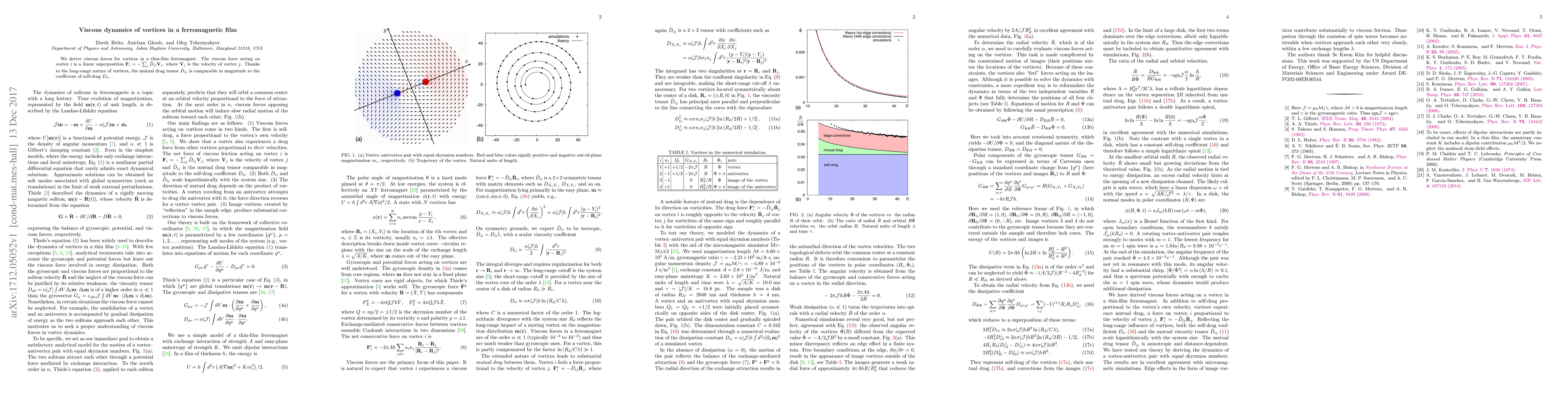 Researchers derived a formula to calculate viscous forces acting on vortices in thin ferromagnetic films, showing that mutual drag between vortices can significantly affect their motion.