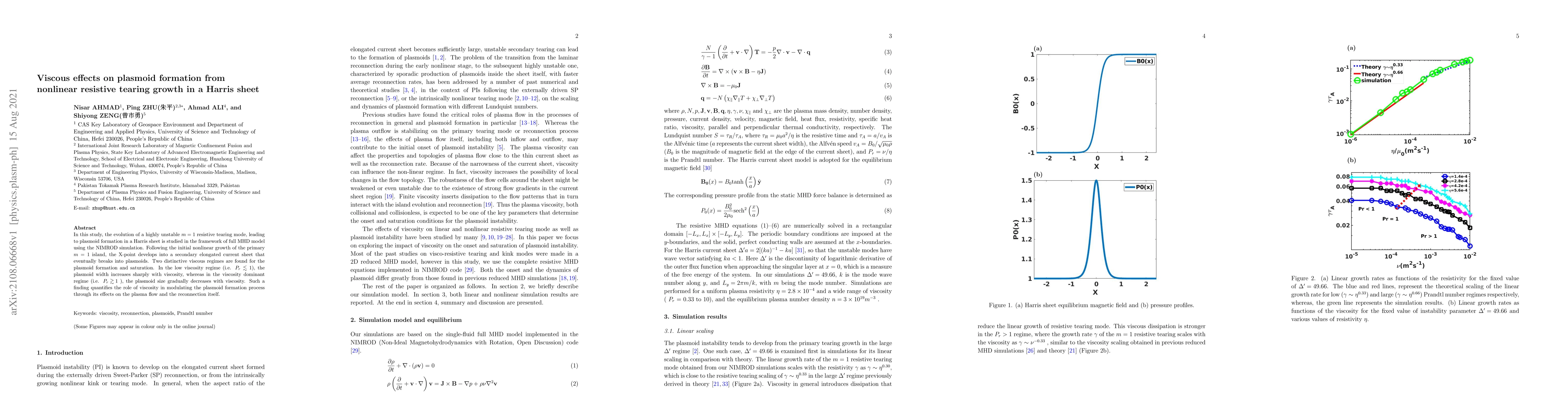 This study investigates the impact of viscosity on plasmoid formation in a Harris sheet via nonlinear resistive tearing mode using full MHD simulations. The research identifies two distinct viscous regimes affecting plasmoid size, highlighting the complex role of viscosity in modulating the plasmoid formation process.