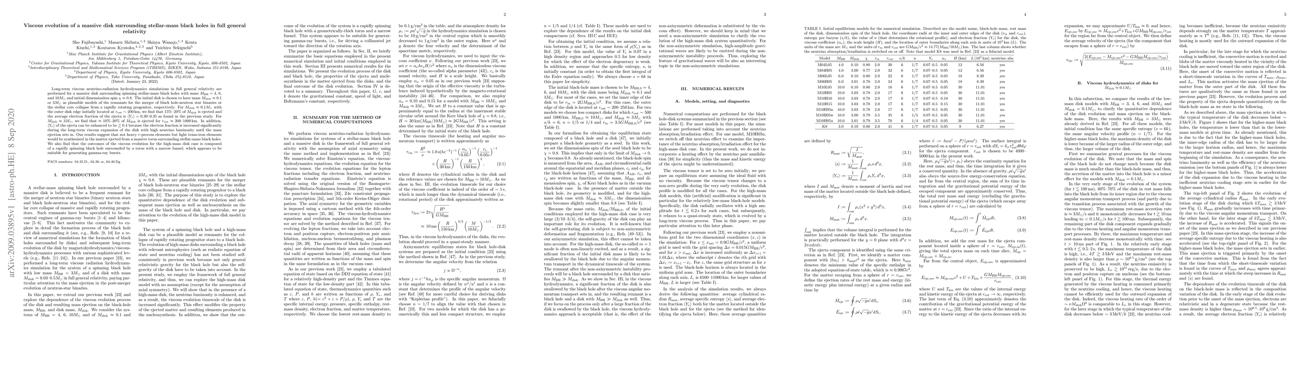 The paper presents general relativity simulations of massive accretion disks around stellar-mass black holes, finding that 10%-20% of the disk mass can be ejected, with electron fractions (<Y_e>) enhanced to >0.4. This suggests light trans-iron element synthesis, rather than heavy r-process elements. The ejected matter, along with a rapidly spinning black hole and narrow funnel, could generate gamma-ray bursts.