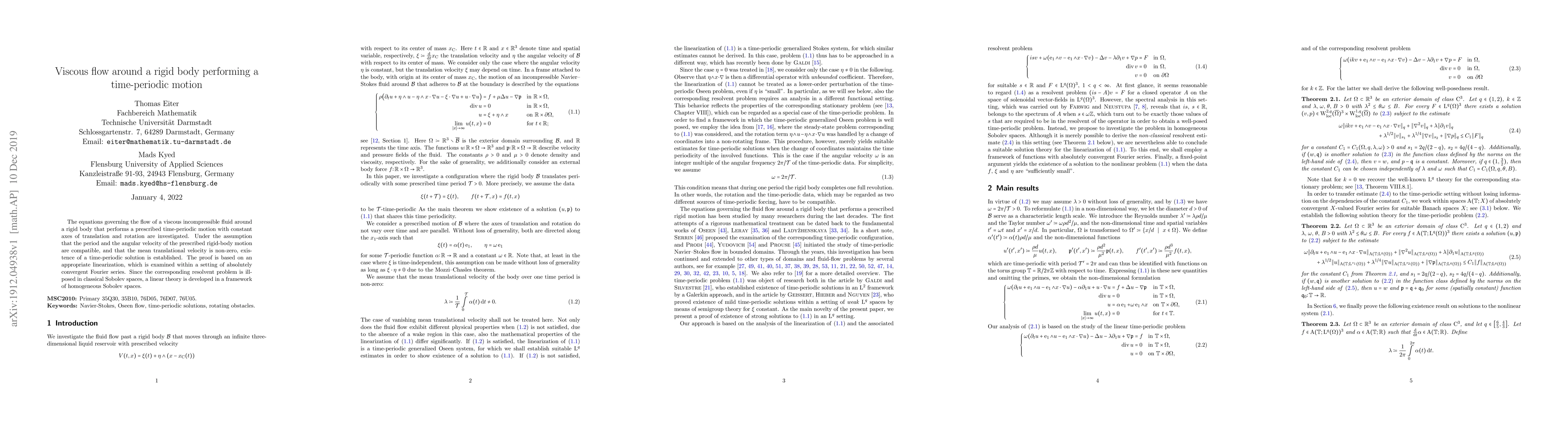 The equations governing the flow of a viscous incompressible fluid around a rigid body that performs a prescribed time-periodic motion with constant axes of translation and rotation are investigated. Under the assumption that the period and the angular velocity of the prescribed rigid-body motion are compatible, and that the mean translational velocity is non-zero, existence of a time-periodic solution is established. The proof is based on an appropriate linearization, which is examined within a setting of absolutely convergent Fourier series. Since the corresponding resolvent problem is ill-posed in classical Sobolev spaces, a linear theory is developed in a framework of homogeneous Sobolev spaces.