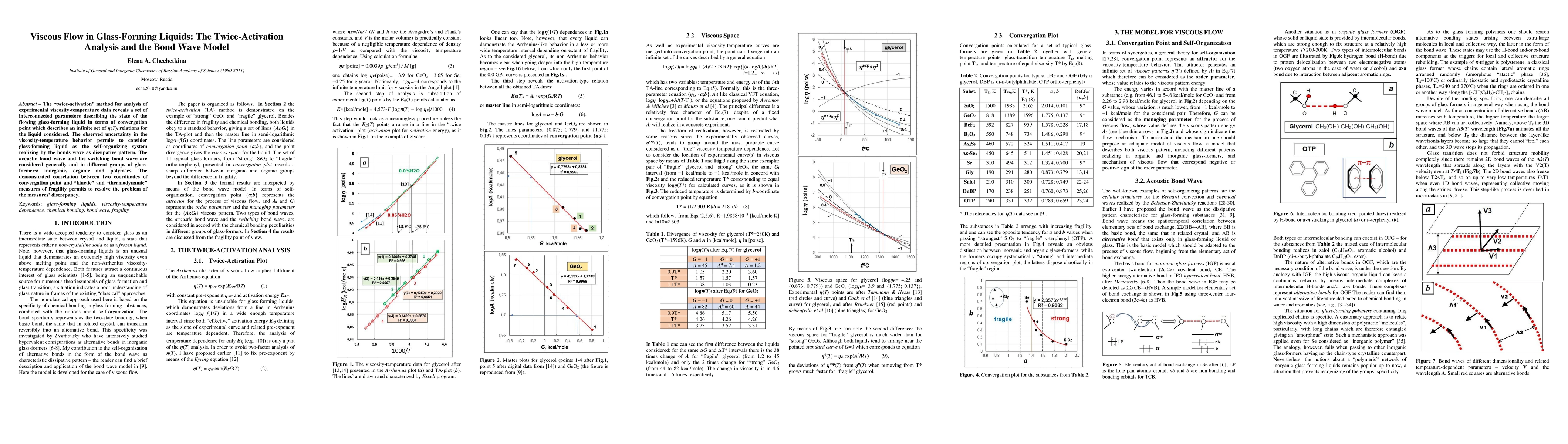 The twice-activation method for analysis of experimental viscosity-temperature data reveals a set of interconnected parameters describing the state of the flowing glass-forming liquid in terms of convergation point which describes an infinite set of viscosity-temperature relations for the liquid considered. The observed uncertainty in the viscosity-temperature behavior permits to consider glass-forming liquid as the self-organizing system realizing by the bonds wave as dissipative pattern. The acoustic bond wave and the switching bond wave are considered generally and in different groups of glass-formers: inorganic, organic and polymers. The demonstrated correlation between two coordinates of convergation point and kinetic and thermodynamic measures of fragility permits to resolve the problem of the measures discrepancy.