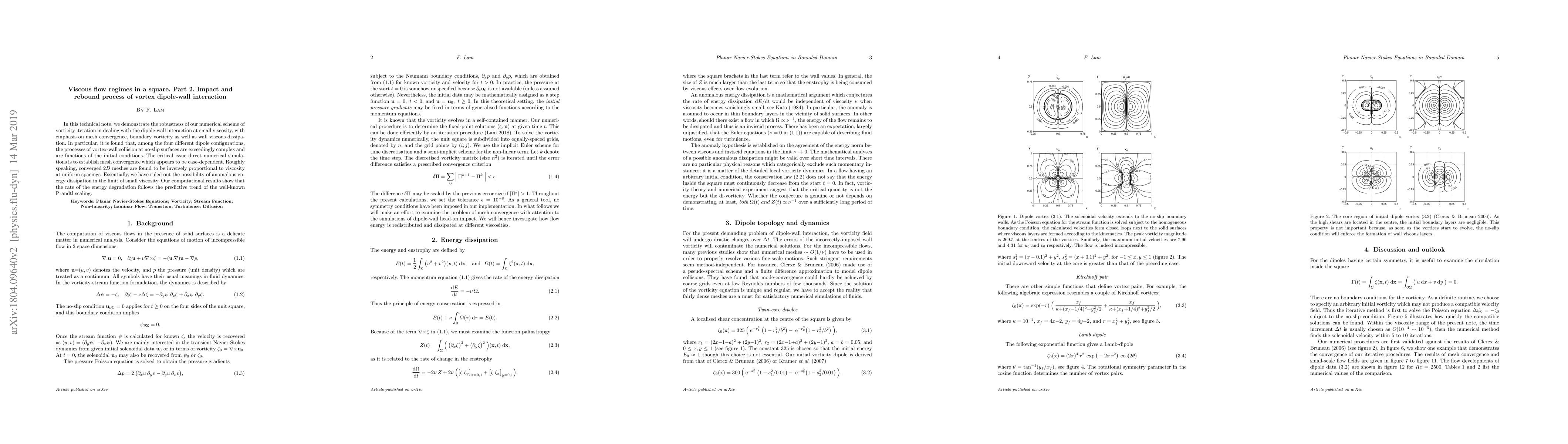 In this technical note, we demonstrate the robustness of our numerical scheme of vorticity iteration in dealing with the dipole-wall interaction at small viscosity, with emphasis on mesh convergence, boundary vorticity as well as wall viscous dissipation. In particular, it is found that, among the four different dipole configurations, the processes of vortex-wall collision at no-slip surfaces are exceedingly complex and are functions of the initial conditions. The critical issue direct numerical simulations is to establish mesh convergence which appears to be case-dependent. Roughly speaking, converged $2D$ meshes are found to be inversely proportional to viscosity at uniform spacings. Essentially, we have ruled out the possibility of anomalous energy dissipation in the limit of small viscosity. Our computational results show that the rate of the energy degradation follows the predictive trend of the well-known Prandtl scaling.