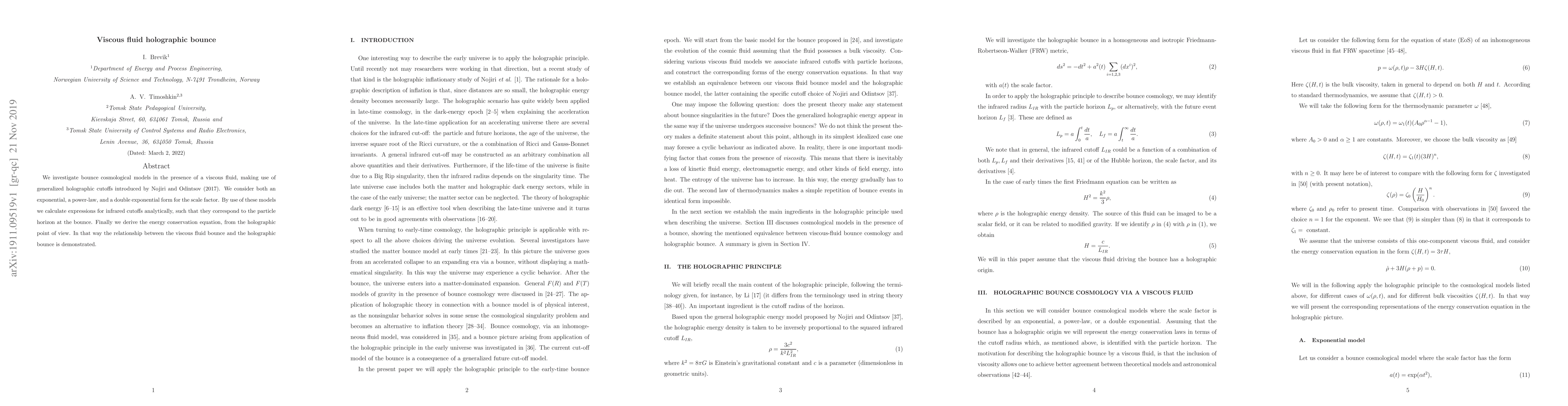 The paper presents a detailed analysis of holographic bounce cosmology with viscous fluids, deriving energy conservation equations for exponential, power-law, and double exponential scale factor models using generalized holographic cutoffs.