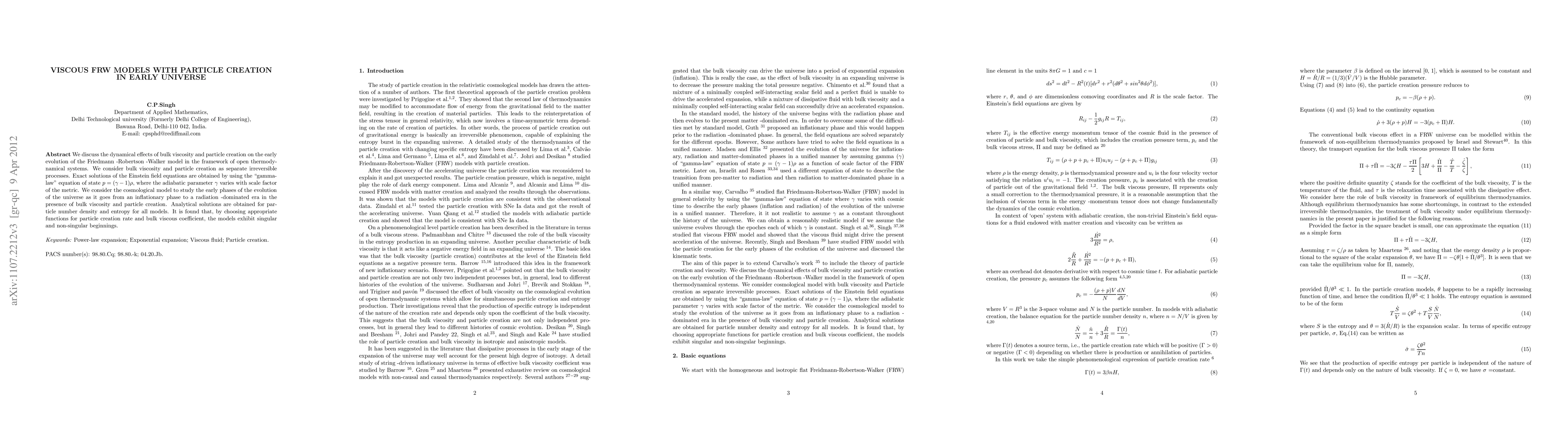 We discuss the dynamical effects of bulk viscosity and particle creation on the early evolution of the Friedmann -Robertson -Walker model in the framework of open thermodynamical systems. We consider bulk viscosity and Particle creation as separate irreversible processes. Exact solutions of the Einstein field equations are obtained by using the "gamma-law" equation of state $p=(\gamma -1)\rho$, where the adiabatic parameter $\gamma$ varies with scale factor of the metric. We consider the cosmological model to study the early phases of the evolution of the universe as it goes from an inflationary phase to a radiation -dominated era in the presence of bulk viscosity and particle creation. Analytical solutions are obtained for particle number density and entropy for all models. It is seen that, by choosing appropriate functions for particle creation rate and bulk viscous coefficient, the models exhibit singular and non-singular beginnings.