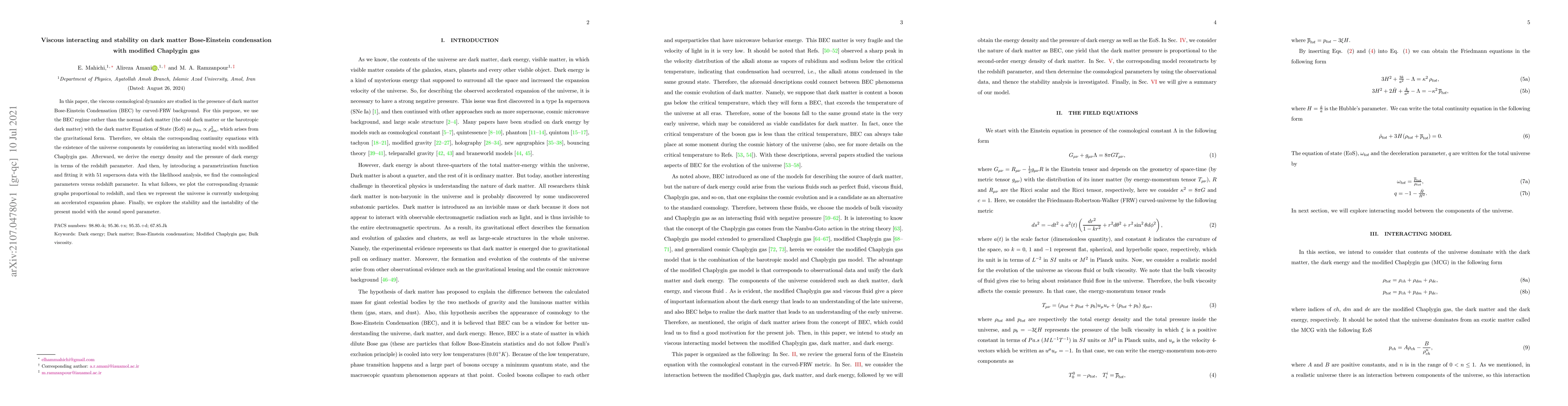 In this paper, the viscous cosmological dynamics are studied in the presence of dark matter Bose-Einstein Condensation (BEC) by curved-FRW background. For this purpose, we use the BEC regime rather than the normal dark matter (the cold dark matter or the barotropic dark matter) with the dark matter Equation of State (EoS) as $p_{dm} \propto \rho_{dm}^2$, which arises from the gravitational form. Therefore, we obtain the corresponding continuity equations with the existence of the universe components by considering an interacting model with modified Chaplygin gas. Afterward, we derive the energy density and the pressure of dark energy in terms of the redshift parameter. And then, by introducing a parametrization function and fitting it with 51 supernova data with the likelihood analysis, we find the cosmological parameters versus redshift parameter. In what follows, we plot the corresponding dynamic graphs proportional to redshift, and then we represent the universe is currently undergoing an accelerated expansion phase. Finally, we explore the stability and the instability of the present model with the sound speed parameter.