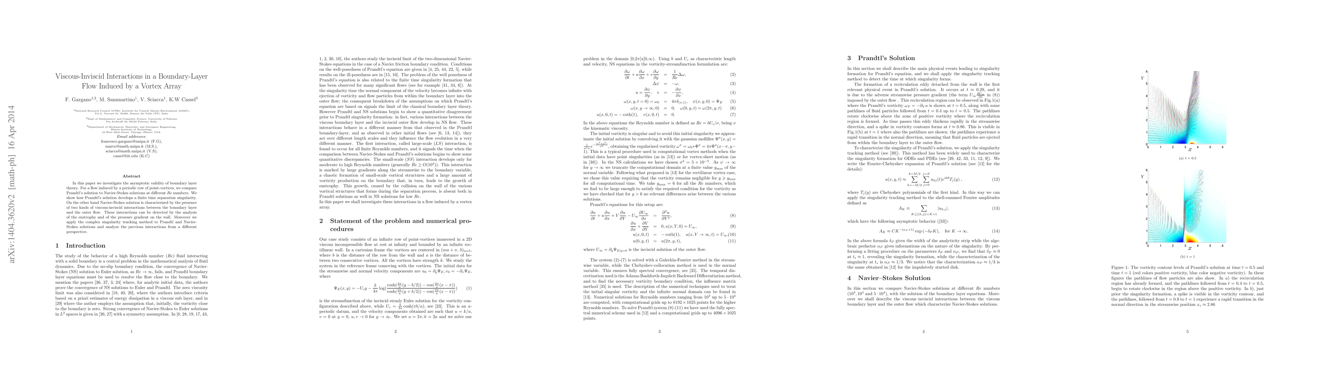 In this paper we investigate the asymptotic validity of boundary layer theory. For a flow induced by a periodic row of point-vortices, we compare Prandtl's solution to Navier-Stokes solutions at different $Re$ numbers. We show how Prandtl's solution develops a finite time separation singularity. On the other hand Navier-Stokes solution is characterized by the presence of two kinds of viscous-inviscid interactions between the boundary layer and the outer flow. These interactions can be detected by the analysis of the enstrophy and of the pressure gradient on the wall. Moreover we apply the complex singularity tracking method to Prandtl and Navier-Stokes solutions and analyze the previous interactions from a different perspective.