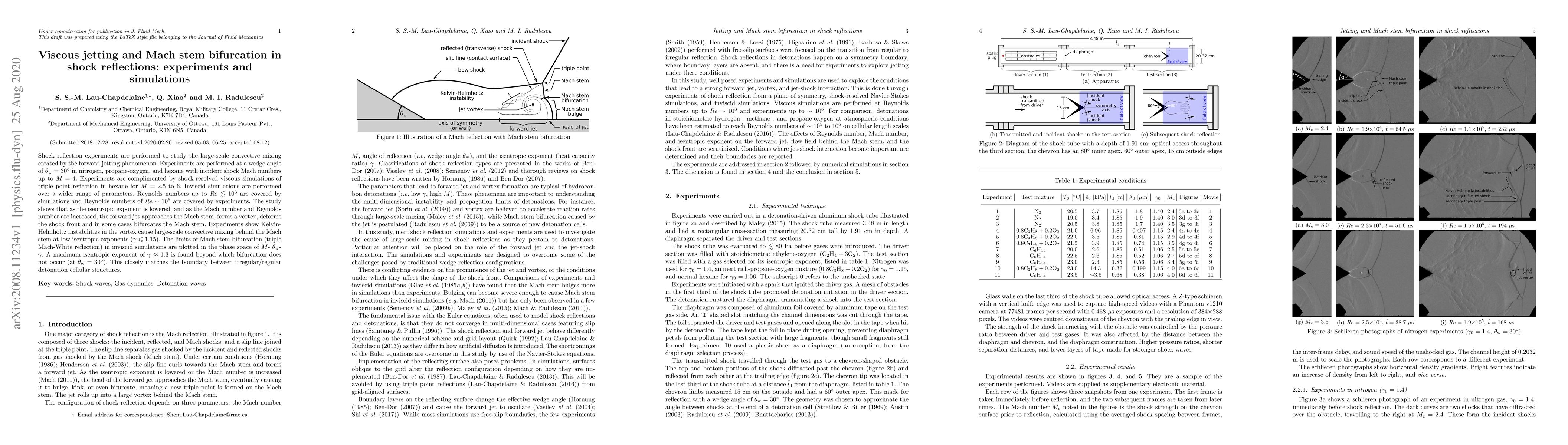 This study investigates shock reflection phenomena through experiments and simulations, focusing on the mixing and Mach stem bifurcation caused by forward jetting. Results show that increased Mach and Reynolds numbers, along with lower isentropic exponents, lead to vortex formation and shock front deformation, sometimes resulting in Mach stem bifurcation. Experimental observations of Kelvin-Helmholtz instabilities highlight significant convective mixing, while simulations reveal a bifurcation limit at $\gamma \approx 1.3$.