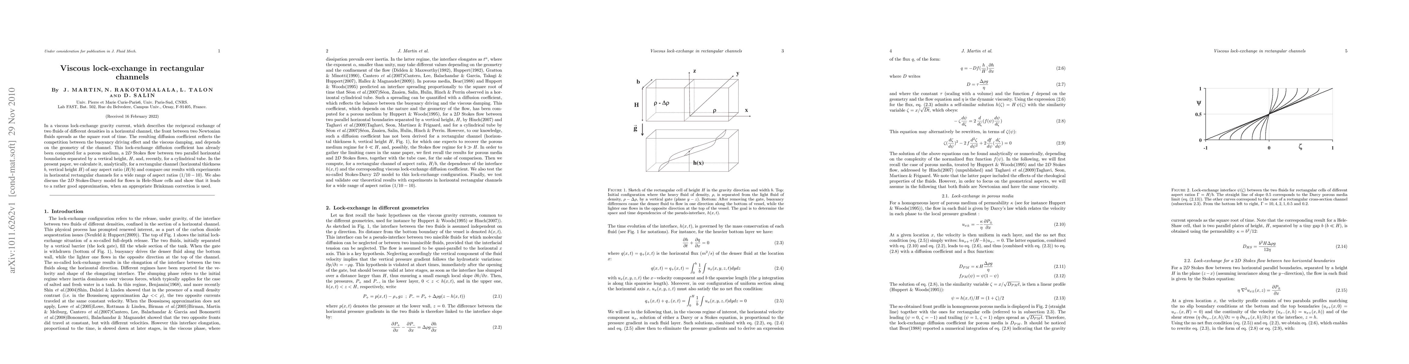 In a viscous lock-exchange gravity current, which describes the reciprocal exchange of two fluids of different densities in a horizontal channel, the front between two Newtonian fluids spreads as the square root of time. The resulting diffusion coefficient reflects the competition between the buoyancy driving effect and the viscous damping, and depends on the geometry of the channel. This lock-exchange diffusion coefficient has already been computed for a porous medium, a 2D Stokes flow between two parallel horizontal boundaries separated by a vertical height, H, and, recently, for a cylindrical tube. In the present paper, we calculate it, analytically, for a rectangular channel (horizontal thickness b, vertical height, H) of any aspect ratio (H/b) and compare our results with experiments in horizontal rectangular channels for a wide range of aspect ratios (1/10-10). We also discuss the 2D Stokes-Darcy model for flows in Hele-Shaw cells and show that it leads to a rather good approximation, when an appropriate Brinkman correction is used.