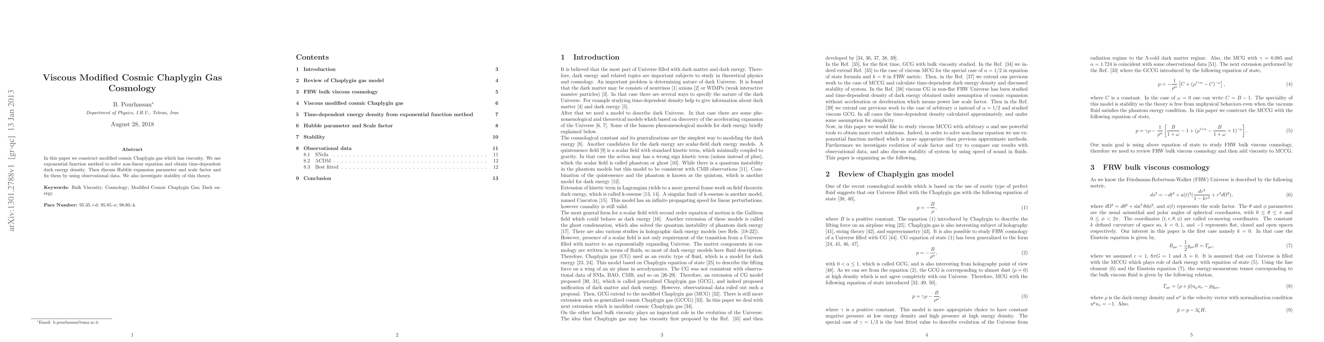 In this paper we construct modified cosmic Chaplygin gas which has viscosity. We use exponential function method to solve non-linear equation and obtain time-dependent dark energy density. Then discuss Hubble expansion parameter and scale factor and fix them by using observational data. We also investigate stability of this theory.