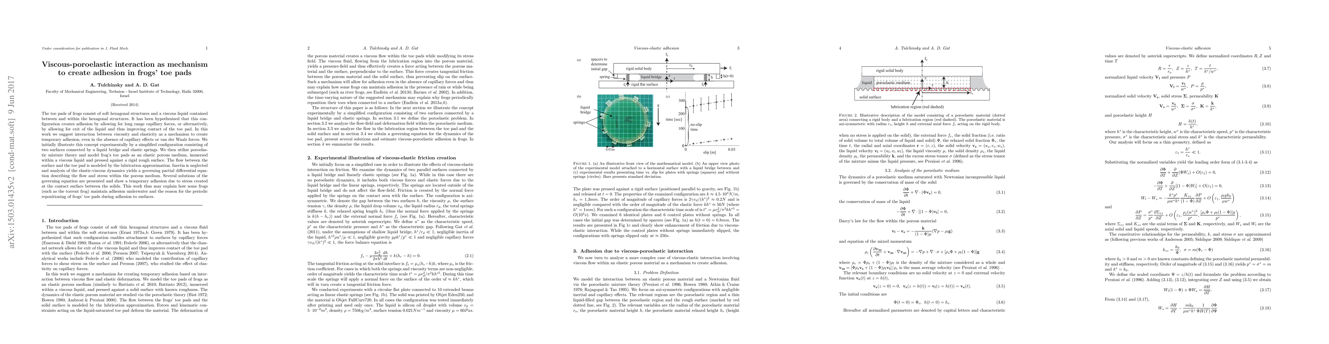 The toe pads of frogs consist of soft hexagonal structures and a viscous liquid contained between and within the hexagonal structures. It has been hypothesized that this configuration creates adhesion by allowing for long range capillary forces, or alternatively, by allowing for exit of the liquid and thus improving contact of the toe pad. In this work we suggest interaction between viscosity and elasticity as a mechanism to create temporary adhesion, even in the absence of capillary effects or van der Waals forces. We initially illustrate this concept experimentally by a simplified configuration consisting of two surfaces connected by a liquid bridge and elastic springs. We then utilize poroelastic mixture theory and model frog's toe pads as an elastic porous medium, immersed within a viscous liquid and pressed against a rigid rough surface. The flow between the surface and the toe pad is modeled by the lubrication approximation. Inertia is neglected and analysis of the elastic-viscous dynamics yields a governing partial differential equation describing the flow and stress within the porous medium. Several solutions of the governing equation are presented and show a temporary adhesion due to stress created at the contact surface between the solids. This work thus may explain how some frogs (such as the torrent frog) maintain adhesion underwater and the reason for the periodic repositioning of frogs' toe pads during adhesion to surfaces.