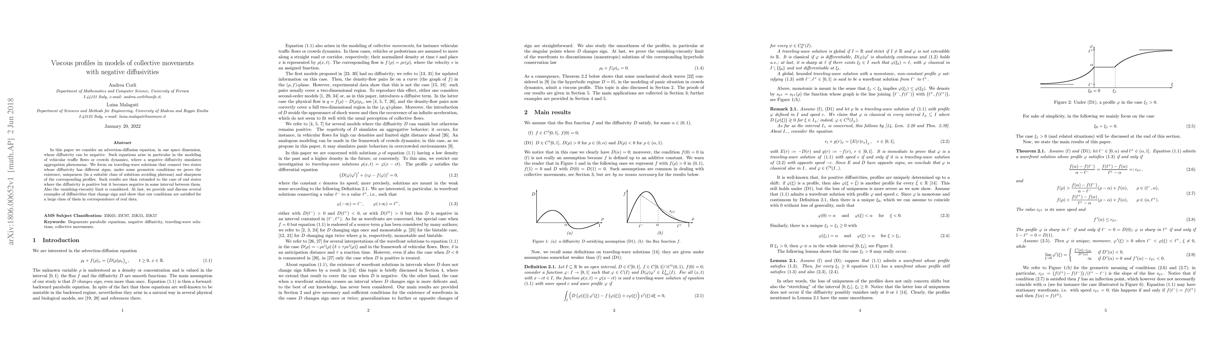 Researchers investigate traveling-wave solutions in models of collective movements with negative diffusivities, proving existence, uniqueness, and sharpness under certain conditions, and apply these findings to various scenarios including real-world data.