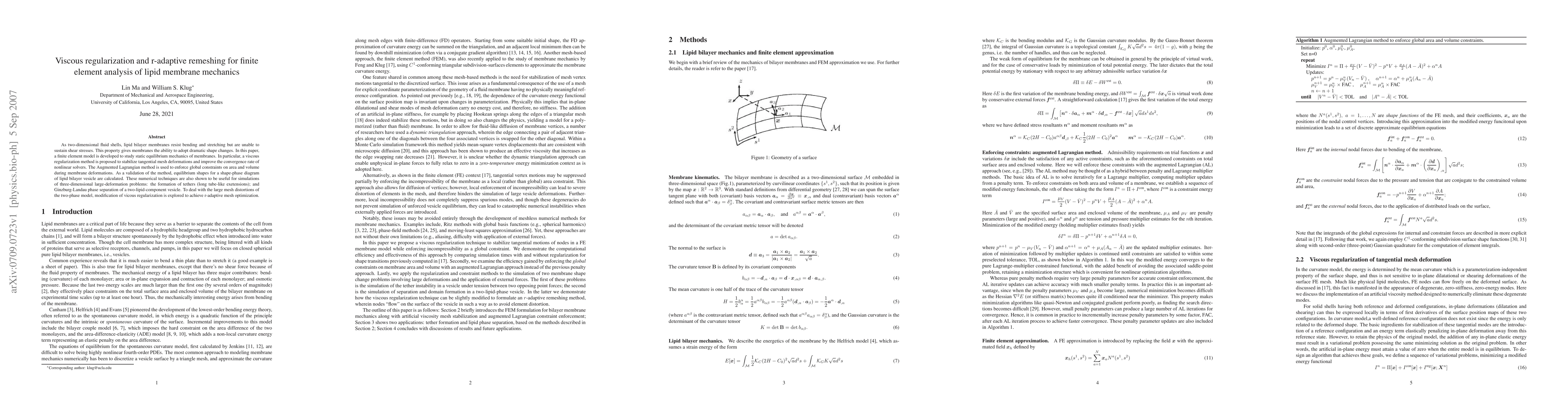 This paper develops a finite element model for studying lipid membrane mechanics, proposing a viscous regularization and r-adaptive remeshing technique to stabilize tangential deformations and improve solver convergence. The model is validated through simulations of lipid bilayer vesicle shapes and large-deformation phenomena.