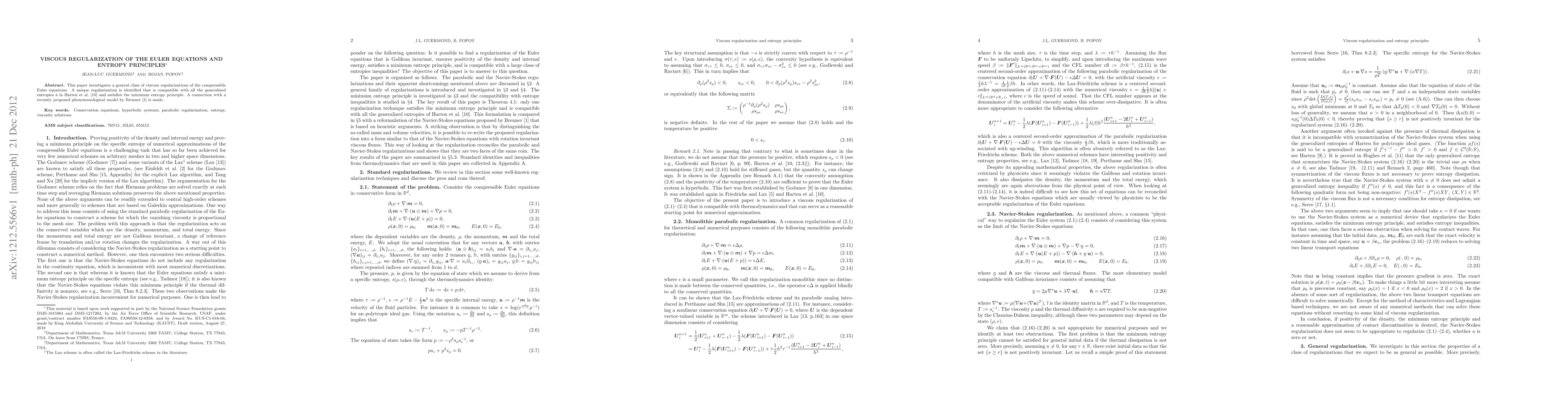 This paper investigates a general class of viscous regularizations of the compressible Euler equations. A unique regularization is identified that is compatible with all the generalized entropies a la Harten and satisfies the minimum entropy principle. A connection with a recently proposed phenomenological model by H. Brenner is made.