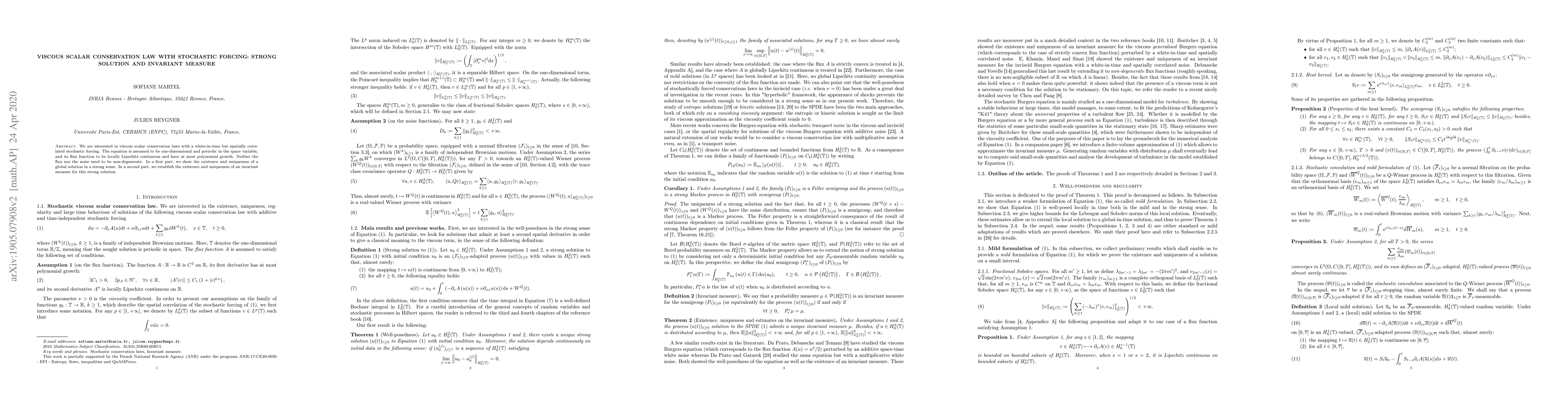 This paper proves the existence and uniqueness of strong solutions for viscous scalar conservation laws with stochastic forcing that is white in time but spatially correlated. It also demonstrates the existence and uniqueness of an invariant measure for the resulting strong solution.