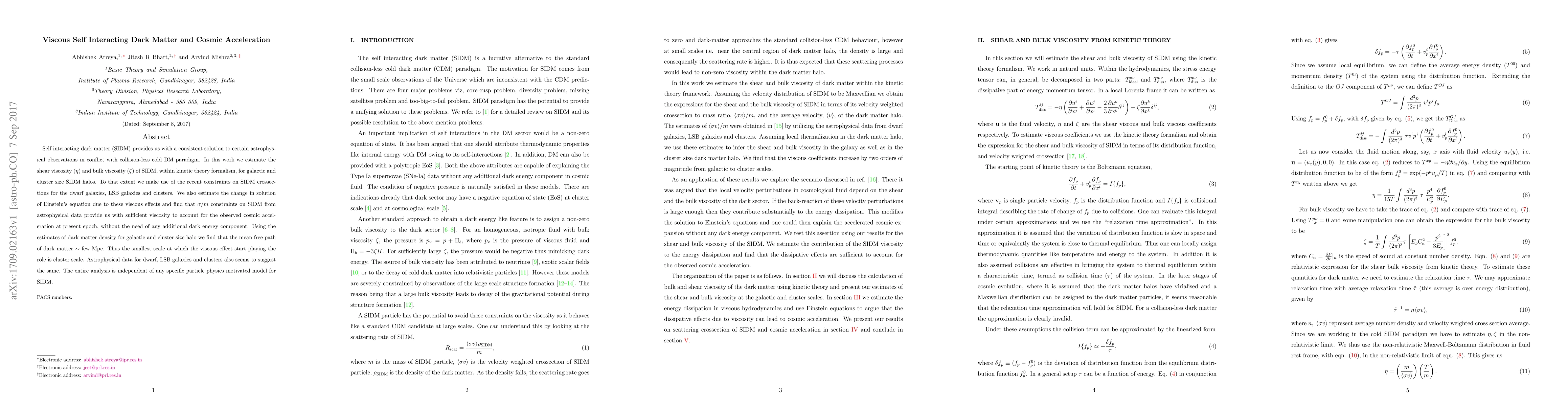 Self interacting dark matter (SIDM) provides us with a consistent solution to certain astrophysical observations in conflict with collision-less cold DM paradigm. In this work we estimate the shear viscosity $(\eta)$ and bulk viscosity $(\zeta)$ of SIDM, within kinetic theory formalism, for galactic and cluster size SIDM halos. To that extent we make use of the recent constraints on SIDM crossections for the dwarf galaxies, LSB galaxies and clusters. We also estimate the change in solution of Einstein's equation due to these viscous effects and find that $\sigma/m$ constraints on SIDM from astrophysical data provide us with sufficient viscosity to account for the observed cosmic acceleration at present epoch, without the need of any additional dark energy component. Using the estimates of dark matter density for galactic and cluster size halo we find that the mean free path of dark matter $\sim$ few Mpc. Thus the smallest scale at which the viscous effect start playing the role is cluster scale. Astrophysical data for dwarf, LSB galaxies and clusters also seems to suggest the same. The entire analysis is independent of any specific particle physics motivated model for SIDM.