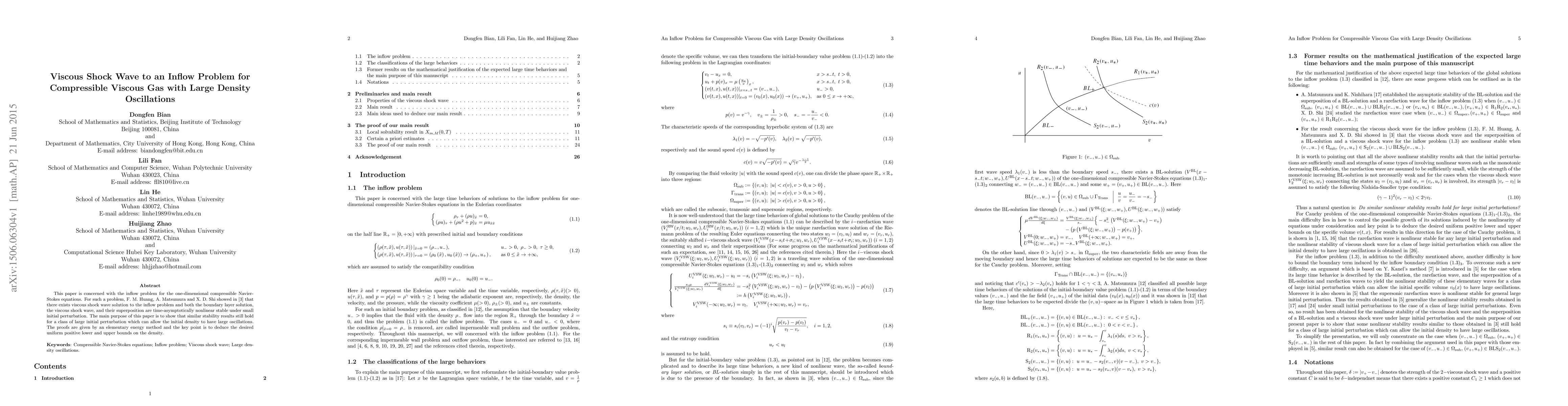 This paper is concerned with the inflow problem for the one-dimensional compressible Navier-Stokes equations. For such a problem, F. M. Huang, A. Matsumura and X. D. Shi showed that there exists viscous shock wave solution to the inflow problem and both the boundary layer solution, the viscous shock wave, and their superposition are time-asymptotically nonlinear stable under small initial perturbation. The main purpose of this paper is to show that similar stability results still hold for a class of large initial perturbation which can allow the initial density to have large oscillations. The proofs are given by an elementary energy method and the key point is to deduce the desired uniform positive lower and upper bounds on the density.