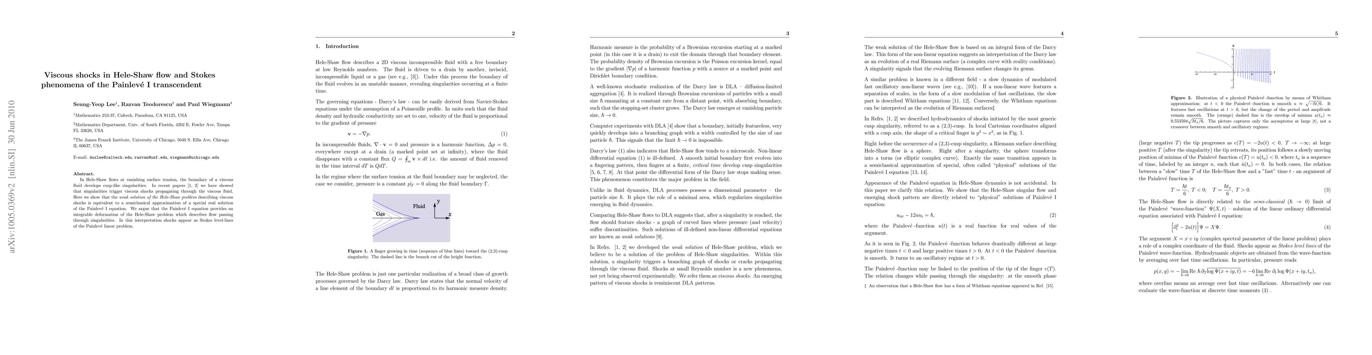 This paper explores viscous shocks in Hele-Shaw flows, demonstrating that these shocks arise from cusp-like singularities and are equivalent to a semiclassical approximation of the Painleve I equation. The Painleve I equation thus provides an integrable deformation describing flow through singularities, with shocks interpreted as Stokes level-lines.
