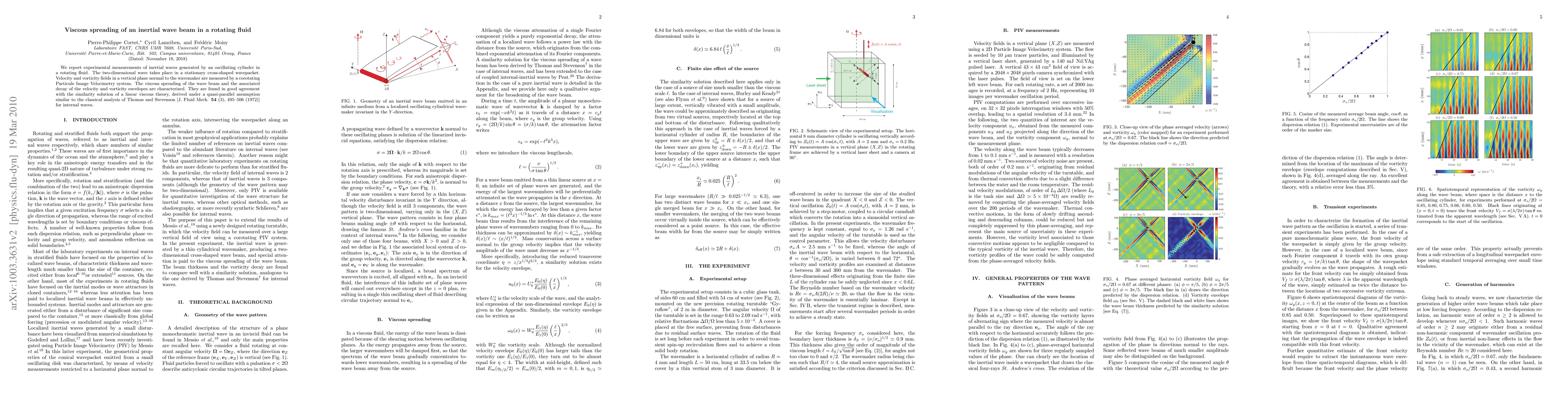 This paper reports on experiments measuring inertial waves generated by an oscillating cylinder in a rotating fluid, focusing on the viscous spreading and decay of a two-dimensional wave beam in a stationary cross-shaped wavepacket. The study finds good agreement between observed velocity and vorticity fields and the predictions of a linear viscous theory.