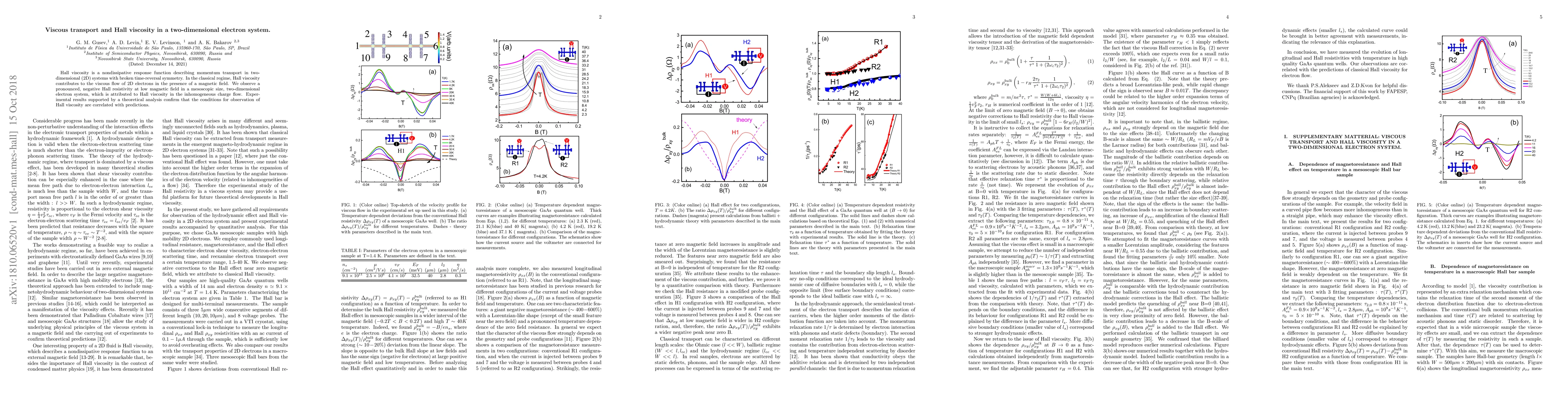 This paper investigates Hall viscosity in a two-dimensional electron system, revealing a pronounced negative Hall resistivity linked to viscous transport under low magnetic fields. Experimental observations are corroborated by theoretical analysis, confirming the presence of Hall viscosity in the system.