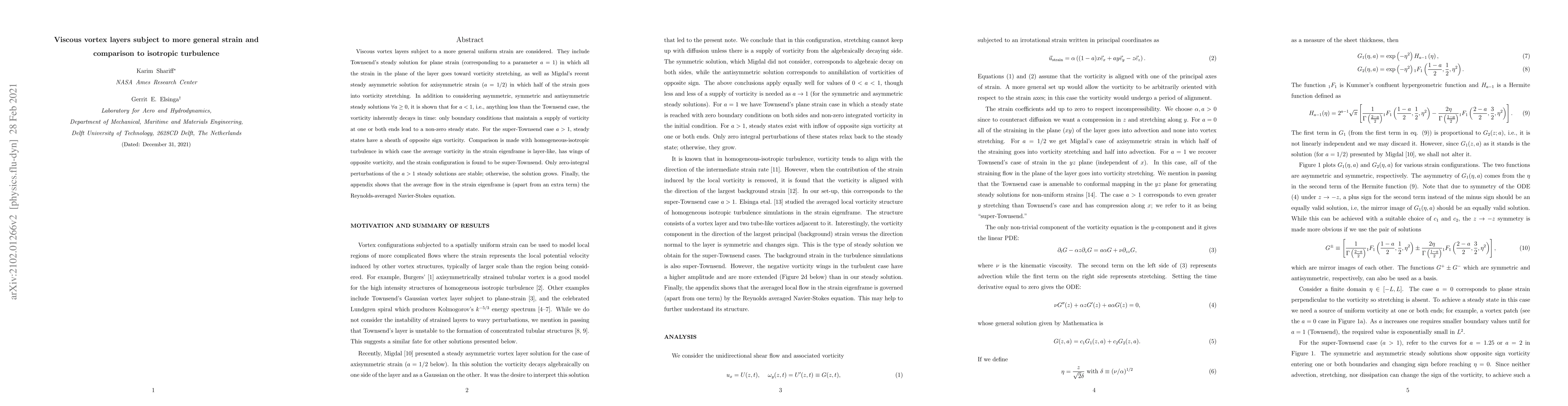 Viscous vortex layers subject to a more general uniform strain are considered. They include Townsend's steady solution for plane strain (corresponding to a parameter $a = 1$) in which all the strain in the plane of the layer goes toward vorticity stretching, as well as Migdal's recent steady asymmetric solution for axisymmetric strain ($a = 1/2$) in which half of the strain goes into vorticity stretching. In addition to considering asymmetric, symmetric and antisymmetric steady solutions $\forall a \ge 0$, it is shown that for $a < 1$, i.e., anything less than the Townsend case, the vorticity inherently decays in time: only boundary conditions that maintain a supply of vorticity at one or both ends lead to a non-zero steady state. For the super-Townsend case $a > 1$, steady states have a sheath of opposite sign vorticity. Comparison is made with homogeneous-isotropic turbulence in which case the average vorticity in the strain eigenframe is layer-like, has wings of opposite vorticity, and the strain configuration is found to be super-Townsend. Only zero-integral perturbations of the $a > 1$ steady solutions are stable; otherwise, the solution grows. Finally, the appendix shows that the average flow in the strain eigenframe is (apart from an extra term) the Reynolds-averaged Navier-Stokes equation.