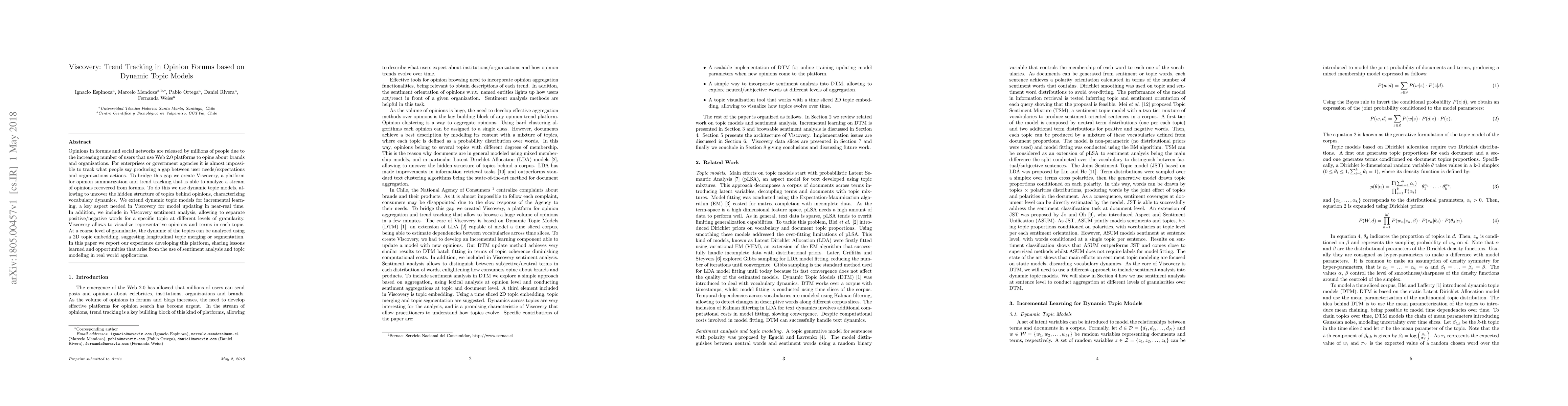 Opinions in forums and social networks are released by millions of people due to the increasing number of users that use Web 2.0 platforms to opine about brands and organizations. For enterprises or government agencies it is almost impossible to track what people say producing a gap between user needs/expectations and organizations actions. To bridge this gap we create Viscovery, a platform for opinion summarization and trend tracking that is able to analyze a stream of opinions recovered from forums. To do this we use dynamic topic models, allowing to uncover the hidden structure of topics behind opinions, characterizing vocabulary dynamics. We extend dynamic topic models for incremental learning, a key aspect needed in Viscovery for model updating in near-real time. In addition, we include in Viscovery sentiment analysis, allowing to separate positive/negative words for a specific topic at different levels of granularity. Viscovery allows to visualize representative opinions and terms in each topic. At a coarse level of granularity, the dynamic of the topics can be analyzed using a 2D topic embedding, suggesting longitudinal topic merging or segmentation. In this paper we report our experience developing this platform, sharing lessons learned and opportunities that arise from the use of sentiment analysis and topic modeling in real world applications.
