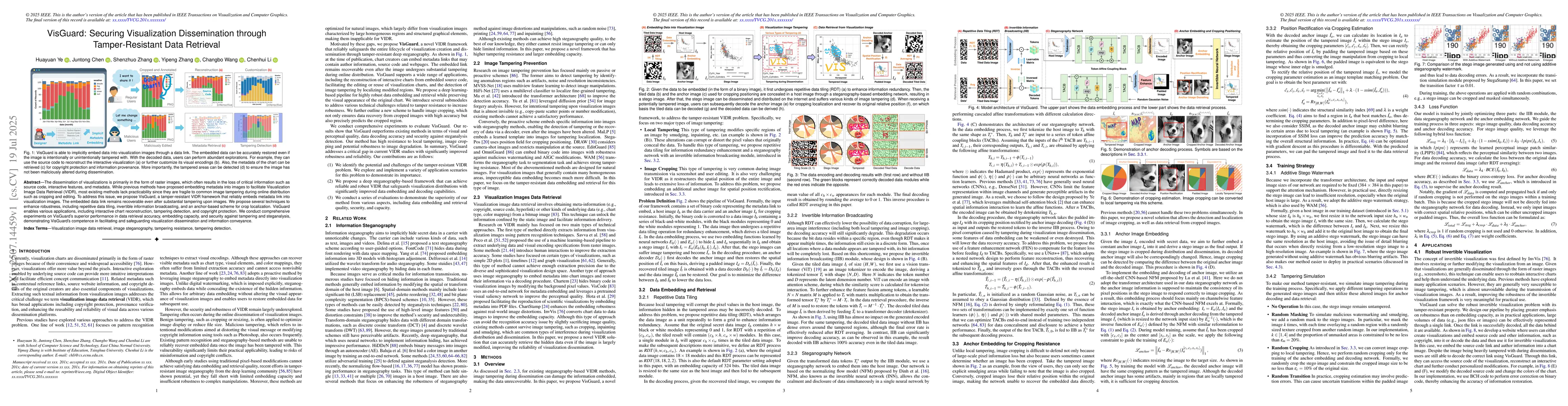 The dissemination of visualizations is primarily in the form of raster images, which often results in the loss of critical information such as source code, interactive features, and metadata. While previous methods have proposed embedding metadata into images to facilitate Visualization Image Data Retrieval (VIDR), most existing methods lack practicability since they are fragile to common image tampering during online distribution such as cropping and editing. To address this issue, we propose VisGuard, a tamper-resistant VIDR framework that reliably embeds metadata link into visualization images. The embedded data link remains recoverable even after substantial tampering upon images. We propose several techniques to enhance robustness, including repetitive data tiling, invertible information broadcasting, and an anchor-based scheme for crop localization. VisGuard enables various applications, including interactive chart reconstruction, tampering detection, and copyright protection. We conduct comprehensive experiments on VisGuard's superior performance in data retrieval accuracy, embedding capacity, and security against tampering and steganalysis, demonstrating VisGuard's competence in facilitating and safeguarding visualization dissemination and information conveyance.