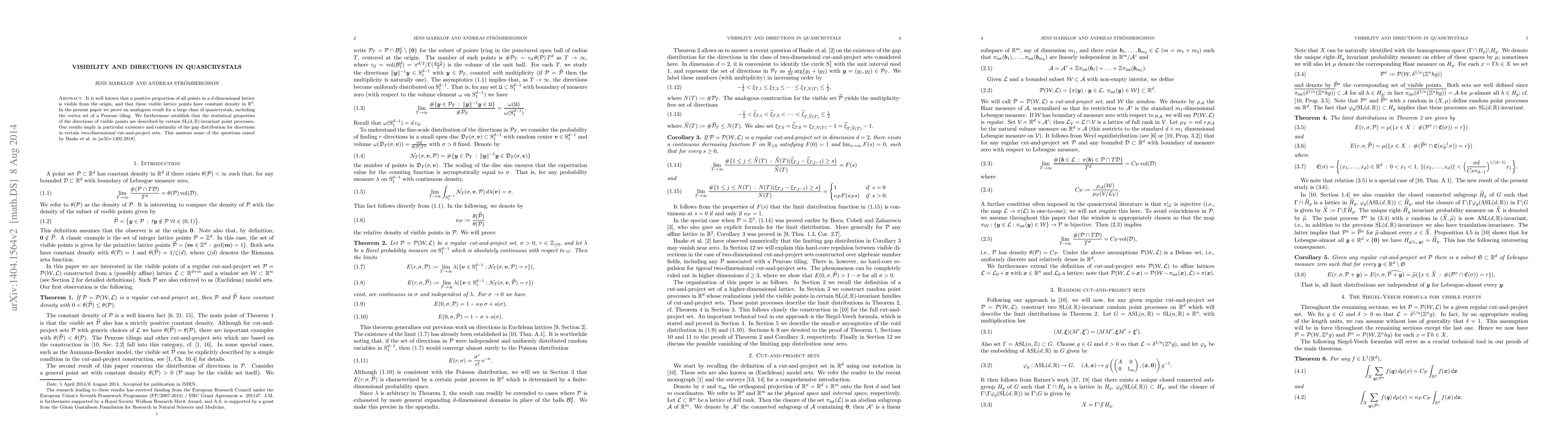 This paper proves that a significant proportion of points in quasicrystals, such as Penrose tilings, are visible from the origin, mirroring the behavior in lattices. It also shows that the statistical directions of these visible points are governed by specific $\operatorname{SL}(d,\mathbb{R})$-invariant point processes, establishing the existence and continuity of the gap distribution for directions in certain quasicrystals.