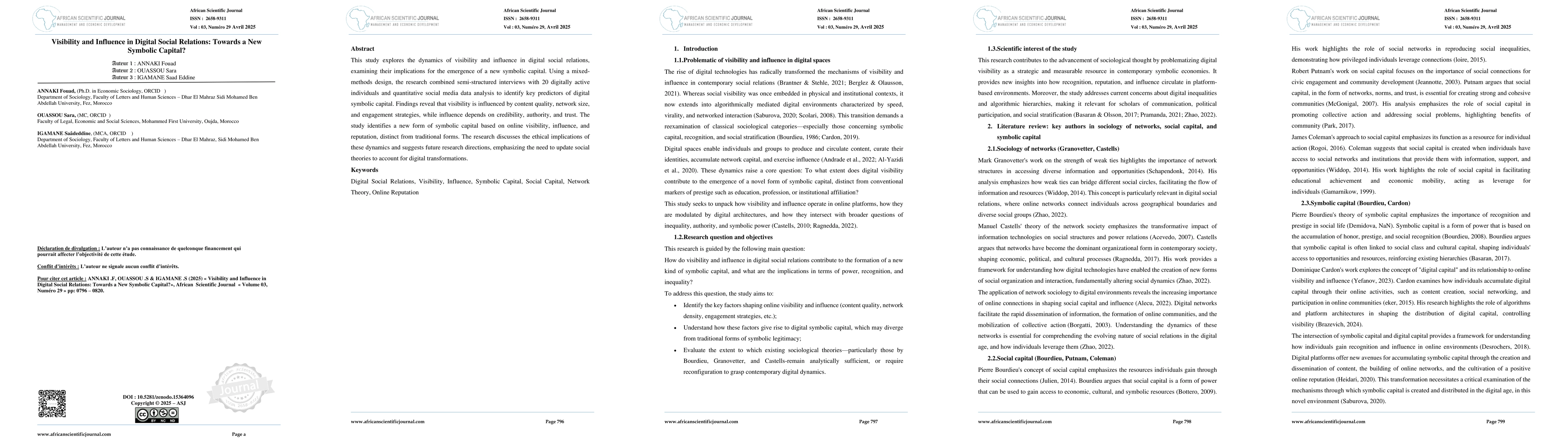 This study explores the dynamics of visibility and influence in digital social relations, examining their implications for the emergence of a new symbolic capital. Using a mixedmethods design, the research combined semi-structured interviews with 20 digitally active individuals and quantitative social media data analysis to identify key predictors of digital symbolic capital. Findings reveal that visibility is influenced by content quality, network size, and engagement strategies, while influence depends on credibility, authority, and trust. The study identifies a new form of symbolic capital based on online visibility, influence, and reputation, distinct from traditional forms. The research discusses the ethical implications of these dynamics and suggests future research directions, emphasizing the need to update social theories to account for digital transformations.