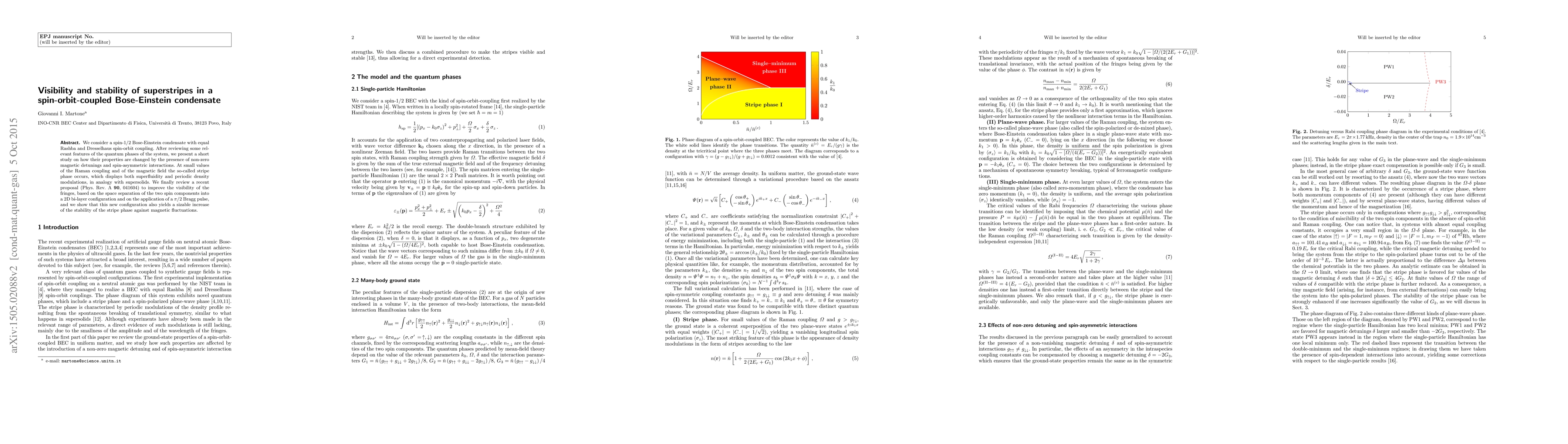 We consider a spin-$1/2$ Bose-Einstein condensate with equal Rashba and Dresselhaus spin-orbit coupling. After reviewing some relevant features of the quantum phases of the system, we present a short study on how their properties are changed by the presence of non-zero magnetic detunings and spin-asymmetric interactions. At small values of the Raman coupling and of the magnetic field the so-called stripe phase occurs, which displays both superfluidity and periodic density modulations, in analogy with supersolids. We finally review a recent proposal (Phys. Rev. A 90, 041604) to improve the visibility of the fringes, based on the space separation of the two spin components into a 2D bi-layer configuration and on the application of a $\pi/2$ Bragg pulse, and we show that this new configuration also yields a sizable increase of the stability of the stripe phase against magnetic fluctuations.
