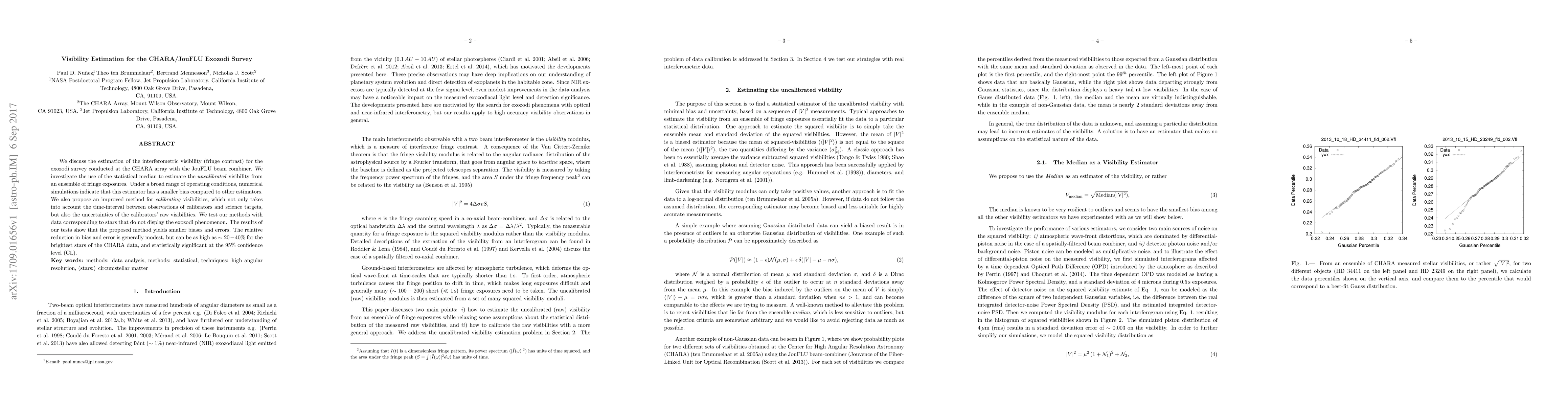We discuss the estimation of the interferometric visibility (fringe contrast) for the exozodi survey conducted at the CHARA array with the JouFLU beam combiner. We investigate the use of the statistical median to estimate the uncalibrated visibility from an ensemble of fringe exposures. Under a broad range of operating conditions, numerical simulations indicate that this estimator has a smaller bias compared to other estimators. We also propose an improved method for calibrating visibilities, which not only takes into account the time-interval between observations of calibrators and science targets, but also the uncertainties of the calibrators' raw visibilities. We test our methods with data corresponding to stars that do not display the exozodi phenomenon. The results of our tests show that the proposed method yields smaller biases and errors. The relative reduction in bias and error is generally modest, but can be as high as $\sim 20-40\%$ for the brightest stars of the CHARA data, and statistically significant at the $95\%$ confidence level (CL).
