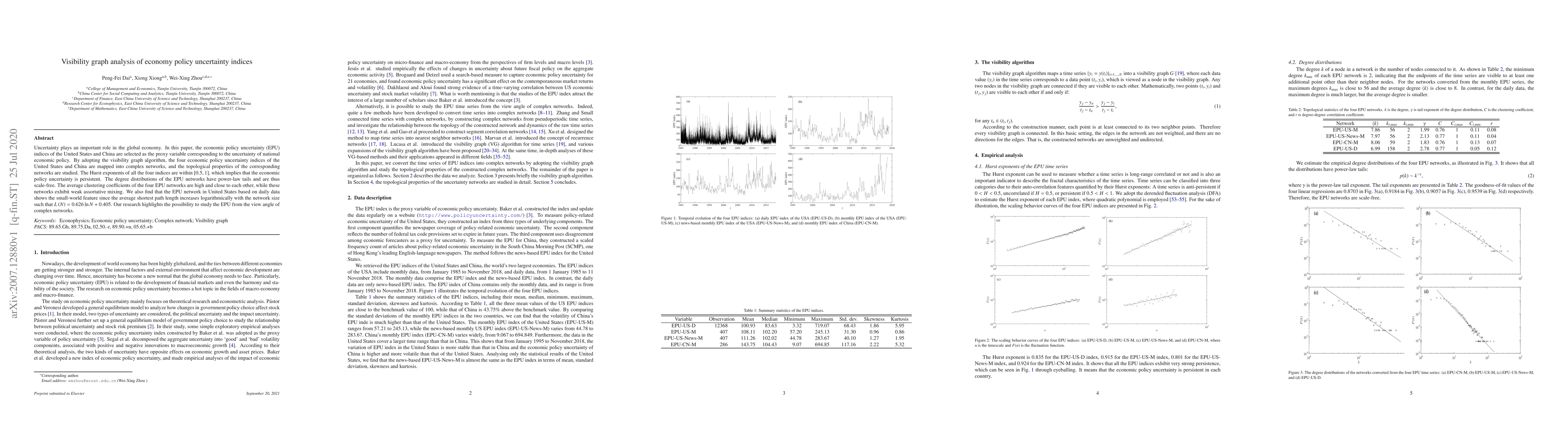 This paper uses visibility graph analysis to study economic policy uncertainty (EPU) indices of the U.S. and China, mapping them into complex networks. The findings show persistent uncertainty, scale-free degree distributions, and small-world features in the U.S. EPU network.