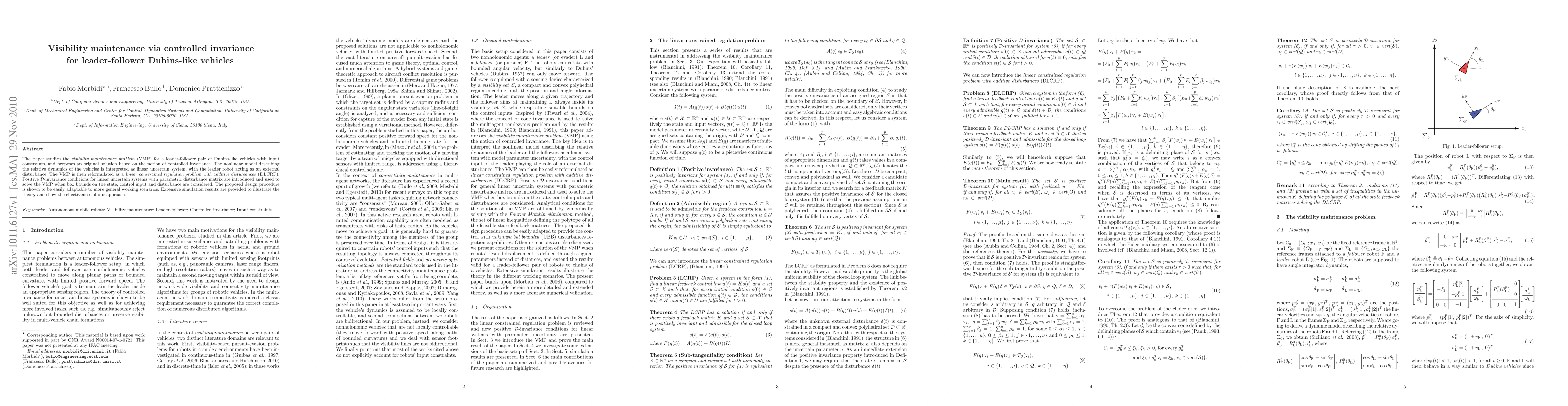 The paper proposes a controlled invariance-based solution for maintaining visibility between a leader and follower pair of Dubins-like vehicles under input constraints. It reformulates the visibility maintenance problem as a linear constrained regulation problem and uses positive D-invariance conditions to achieve the solution, demonstrating adaptability and effectiveness through simulations.