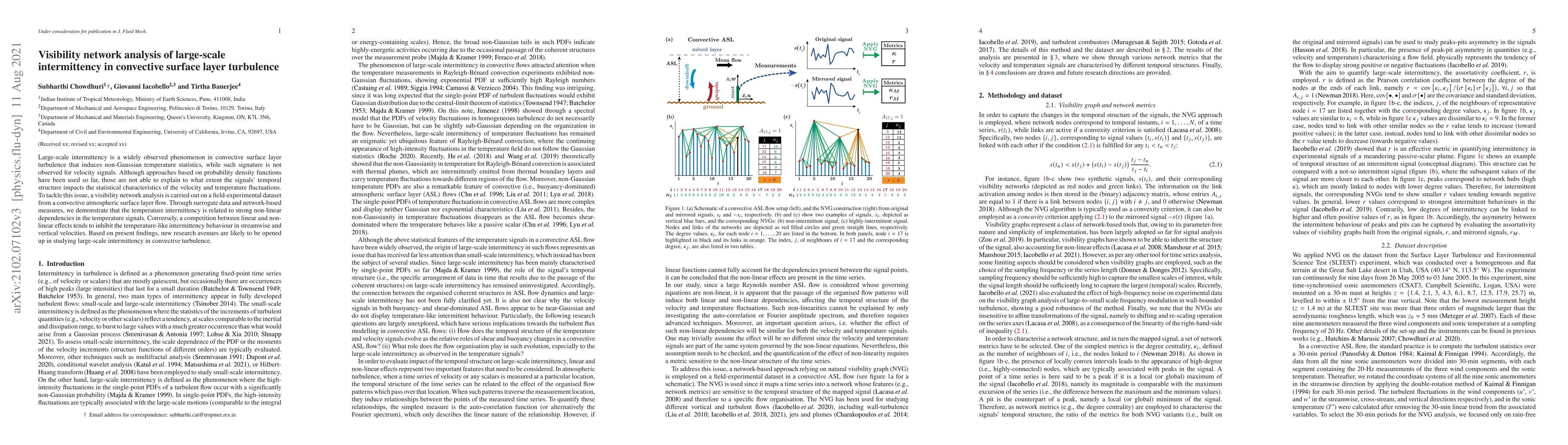 This paper employs visibility network analysis to investigate the large-scale intermittency in convective surface layer turbulence, revealing that temperature fluctuations exhibit strong non-linear dependencies, while velocity fluctuations show a balance between linear and non-linear effects. The study suggests new directions for understanding intermittency in turbulent flows.