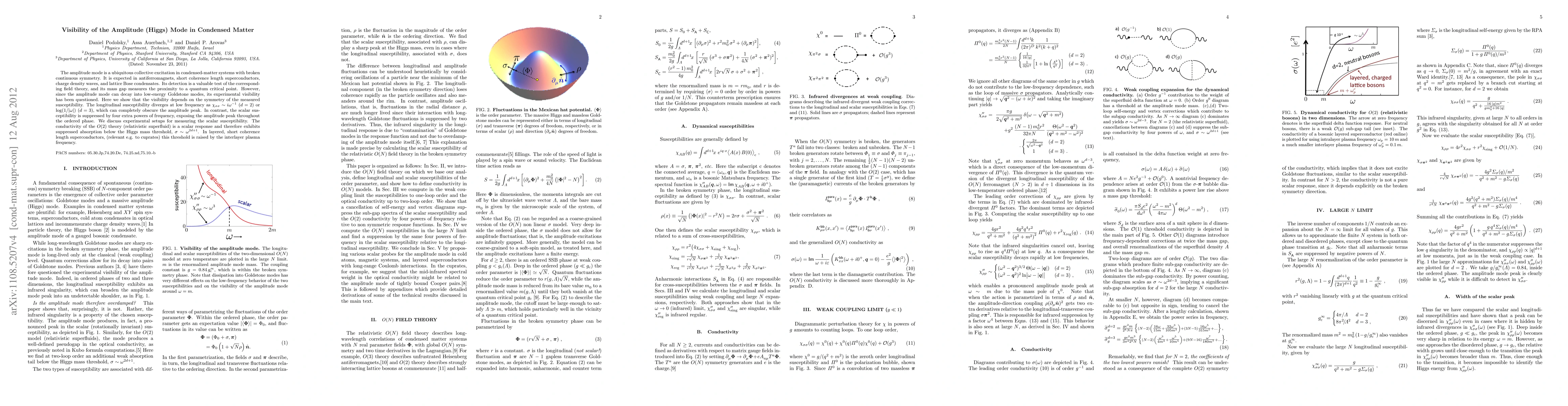 The amplitude mode is a ubiquitous collective excitation in condensed matter systems with broken continuous symmetry. It is expected in antiferromagnets, short coherence length superconductors, charge density waves, and lattice Bose condensates. Its detection is a valuable test of the corresponding field theory, and its mass gap measures the proximity to a quantum critical point. However, since the amplitude mode can decay into low-energy Goldstone modes, its experimental visibility has been questioned. Here we show that the visibility depends on the symmetry of the measured susceptibility. The longitudinal susceptibility diverges at low frequency as \chi_{\sigma\sigma} ~ i/\omega (d=2) or log(1/|\omega|) (d=3), which can completely obscure the amplitude peak. In contrast, the scalar susceptibility is suppressed by four extra powers of frequency, exposing the amplitude peak throughout the ordered phase. We discuss experimental setups for measuring the scalar susceptibility. The conductivity of the O(2) theory (relativistic superfluid) is a scalar response and therefore exhibits suppressed absorption below the Higgs mass threshold, \sigma ~ \omega^{2d+1}. In layered, short coherence length superconductors, (relevant e.g. to cuprates) this threshold is raised by the interlayer plasma frequency.