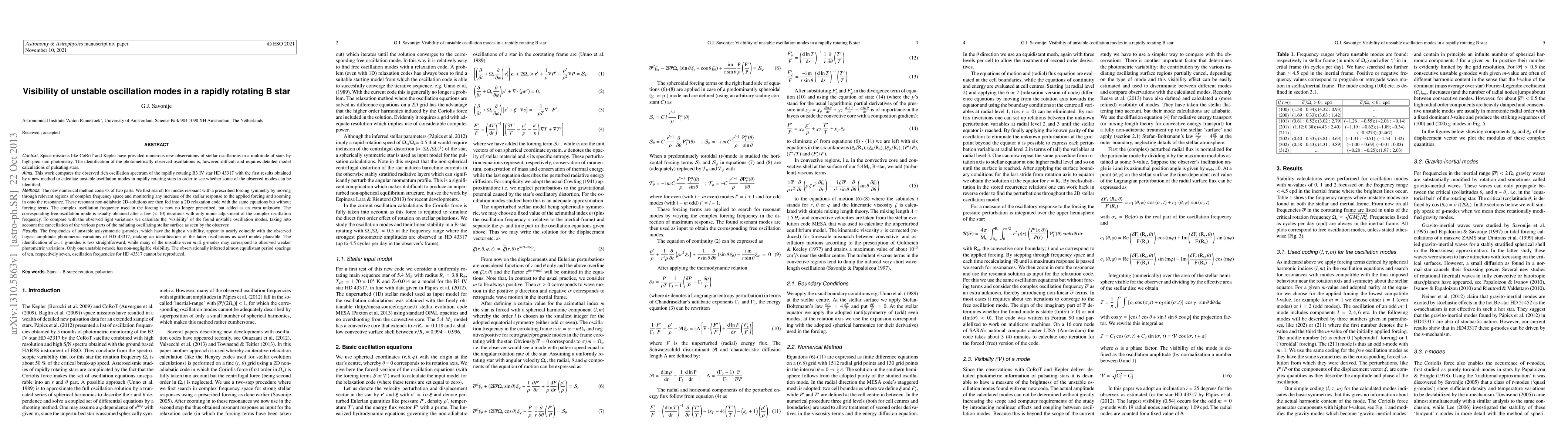 Space missions like CoRoT and Kepler have provided numerous new observations of stellar oscillations in a multitude of stars by high precision photometry. This work compares the observed rich oscillation spectrum of the rapidly rotating B3 IV star HD 43317 with the first results obtained by a new method to calculate unstable oscillation modes in rapidly rotating stars in order to see whether some of the observed modes can be identified. The new numerical method consists of two parts. We first search for modes resonant with a prescribed forcing symmetry by moving through relevant regions of complex frequency space and monitoring any increase of the stellar response to the applied forcing and zooming in onto the resonance. These resonant non-adiabatic 2D-solutions are then fed into a 2D relaxation code with the same equations but without forcing terms. The complex oscillation frequency used in the forcing is now no longer prescribed, but added as an extra unknown. The corresponding free oscillation mode is usually obtained after a few ($<10$) iterations with only minor adjustment of the complex oscillation frequency. To compare with the observed light variations we calculate the `visibility' of the found unstable oscillation modes, taking into account the cancellation of the various parts of the radiating oscillating stellar surface as seen by the observer. The frequencies of unstable axisymmetric g-modes, which have the highest visibility, appear to nearly coincide with the observed largest amplitude photometric variations of HD 43317, making an identification of the latter oscillations as $m$=0 modes plausible. The identification of $m$=1 g-modes is less straightforward, while many of the unstable even $m$=2 g-modes may correspond to observed weaker photometric variations.