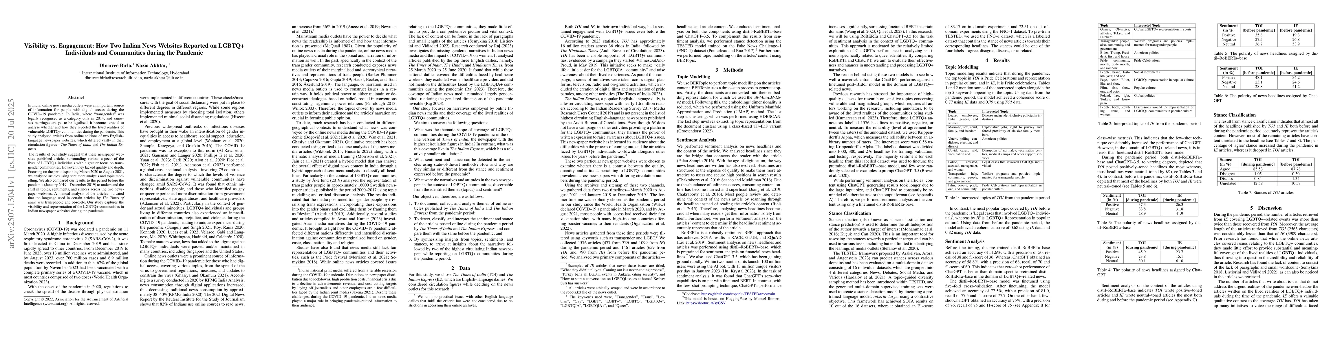 In India, online news media outlets were an important source of information for people with digital access during the COVID-19 pandemic. In India, where "transgender" was legally recognised as a category only in 2014, and same-sex marriages are yet to be legalised, it becomes crucial to analyse whether and how they reported the lived realities of vulnerable LGBTQ+ communities during the pandemic. This study analysed articles from online editions of two English-language newspaper websites, which differed vastly in their circulation figures-The Times of India and The Indian Express. The results of our study suggest that these newspaper websites published articles surrounding various aspects of the lives of LGBTQ+ individuals with a greater focus on transgender communities. However, they lacked quality and depth. Focusing on the period spanning March 2020 to August 2021, we analysed articles using sentiment analysis and topic modelling. We also compared our results to the period before the pandemic (January 2019 - December 2019) to understand the shift in topics, sentiments, and stances across the two newspaper websites. A manual analysis of the articles indicated that the language used in certain articles by The Times of India was transphobic and obsolete. Our study captures the visibility and representation of the LGBTQ+ communities in Indian newspaper websites during the pandemic.