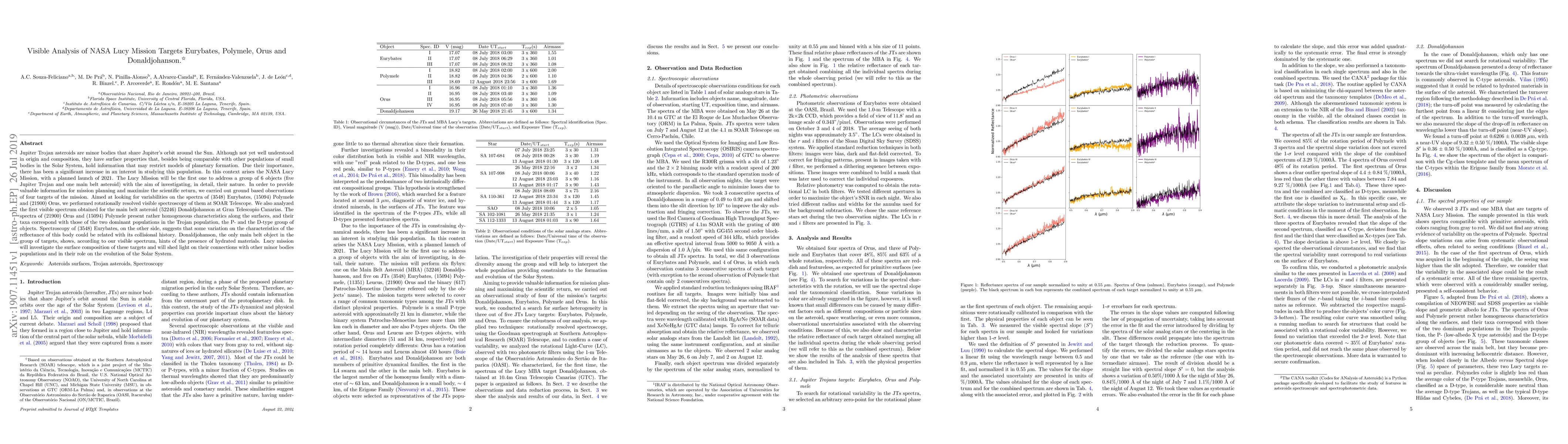 This paper reports ground-based visible spectroscopy of four targets for NASA's Lucy Mission, focusing on Jupiter Trojan asteroids Eurybates, Polymele, Orus, and main belt asteroid Donaldjohanson. The study reveals spectral characteristics that may inform the mission's objectives and planetary formation models.