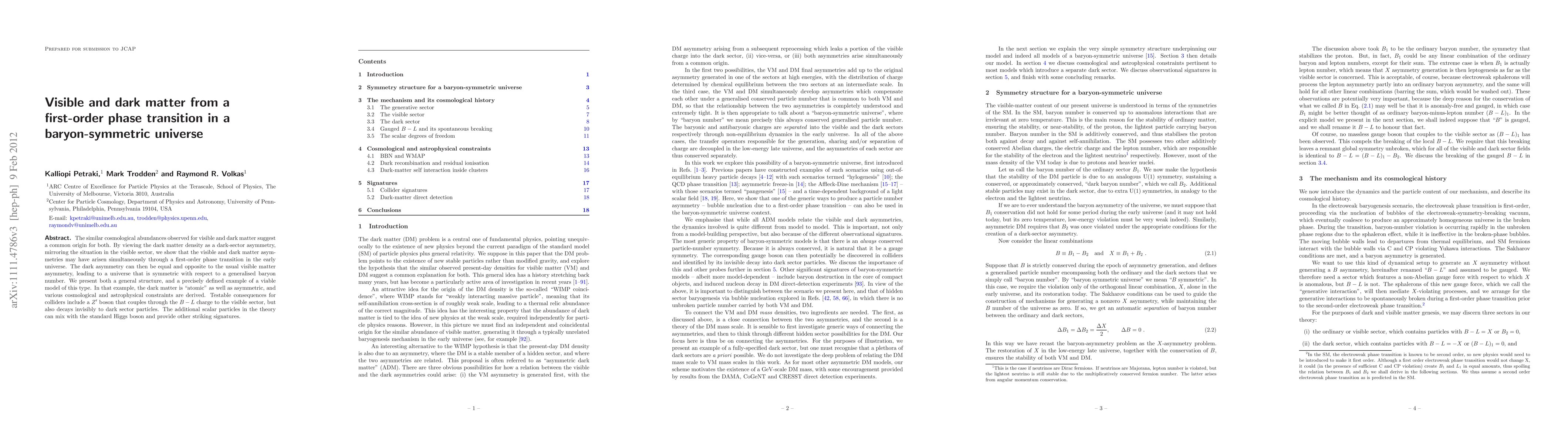 This paper proposes a unified origin for visible and dark matter through a first-order phase transition in a baryon-symmetric universe, suggesting both matter types arise from asymmetries in a dark sector. It presents a model where dark matter is both atomic and asymmetric, with testable collider signatures including a Z' boson and mixed scalar particles.