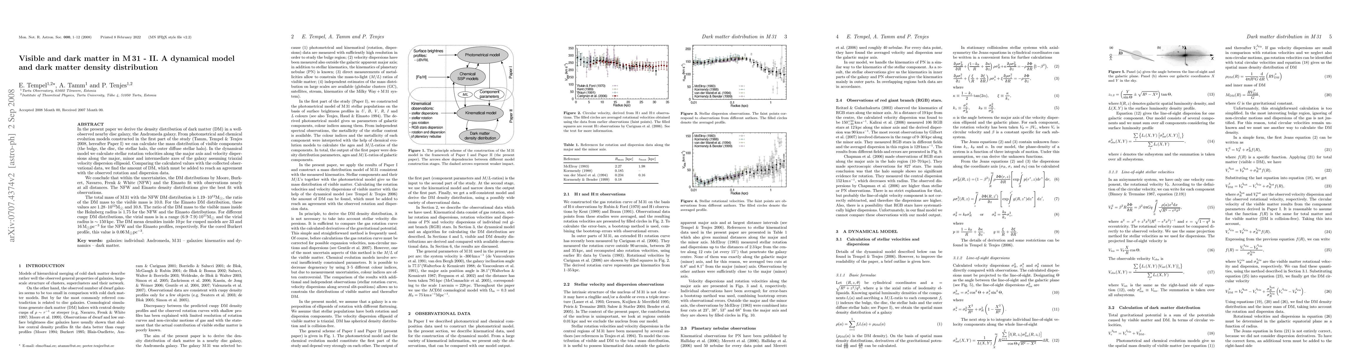 The study calculates the dark matter density distribution in M 31 using a dynamical model and finds that the NFW and Einasto distributions provide the best fit with observational data, indicating a mass ratio of approximately 10:1 between dark and visible matter.