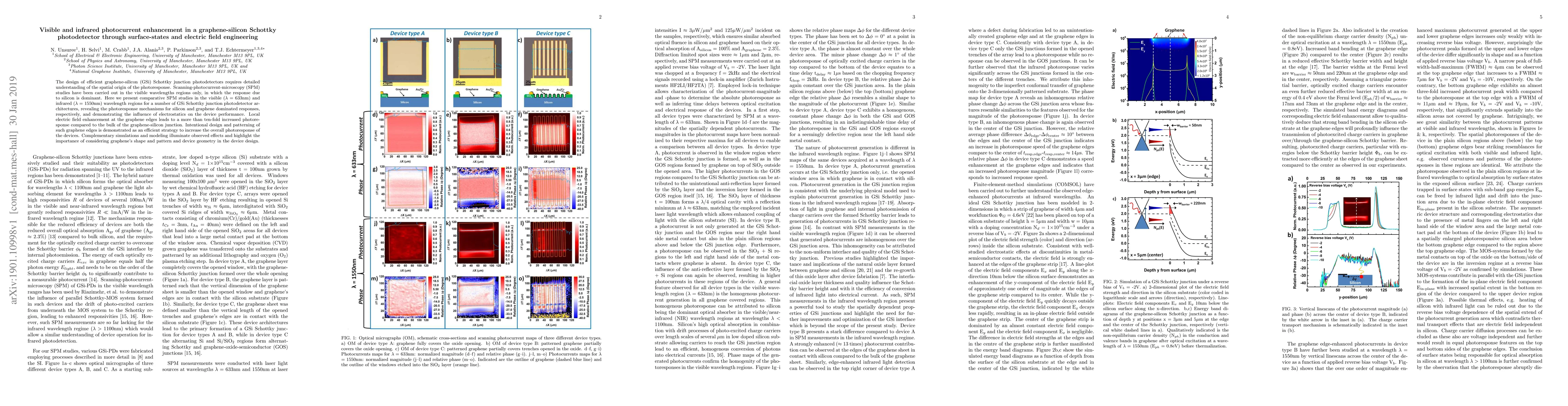 The design of efficient graphene-silicon (GSi) Schottky junction photodetectors requires detailed understanding of the spatial origin of the photoresponse. Scanning-photocurrent-microscopy (SPM) studies have been carried out in the visible wavelengths regions only, in which the response due to silicon is dominant. Here we present comparative SPM studies in the visible ($\lambda$ = 633nm) and infrared ($\lambda$ = 1550nm) wavelength regions for a number of GSi Schottky junction photodetector architectures, revealing the photoresponse mechanisms for silicon and graphene dominated responses, respectively, and demonstrating the influence of electrostatics on the device performance. Local electric field enhancement at the graphene edges leads to a more than ten-fold increased photoresponse compared to the bulk of the graphene-silicon junction. Intentional design and patterning of such graphene edges is demonstrated as an efficient strategy to increase the overall photoresponse of the devices. Complementary simulations and modeling illuminate observed effects and highlight the importance of considering graphene's shape and pattern and device geometry in the device design.