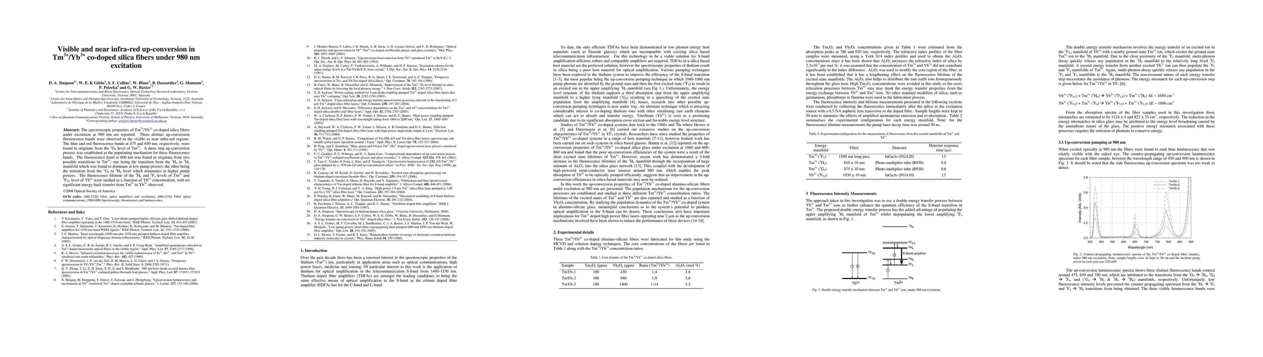 This paper reports on the spectroscopic properties of Tm³⁺/Yb³⁺ co-doped silica fibers under 980 nm excitation, revealing three up-conversion fluorescence bands in the visible to near infra-red regions, with a three-step mechanism established for the blue and red bands. The near-infrared band at 800 nm is attributed to two Tm³⁺ transitions, with no significant energy back transfer from Tm³⁺ to Yb³⁺ observed.