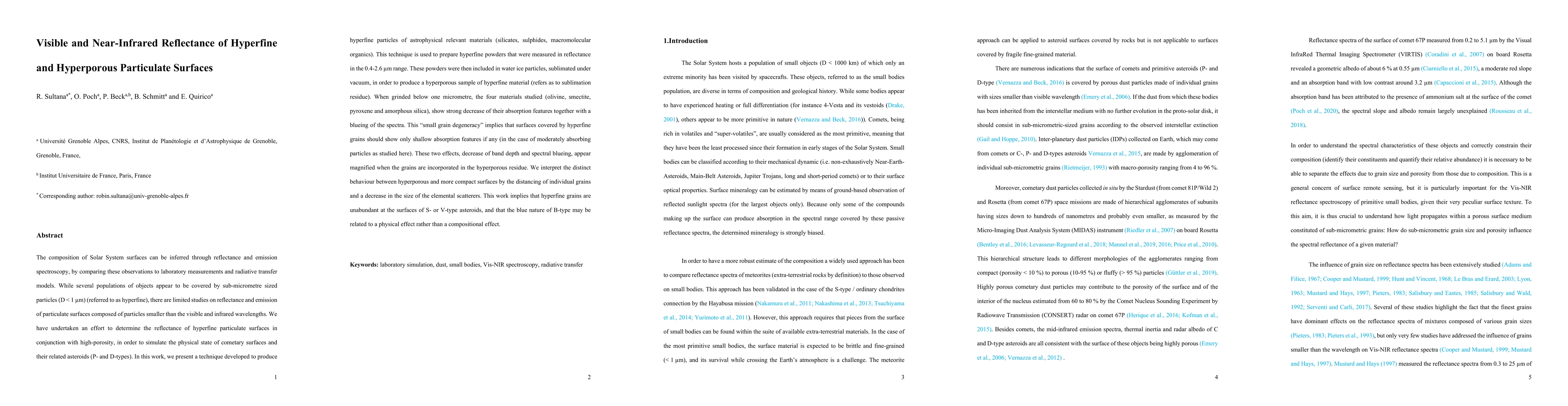 The composition of Solar System surfaces can be inferred through reflectance and emission spectroscopy, by comparing these observations to laboratory measurements and radiative transfer models. While several populations of objects appear to be covered by sub-micrometre sized particles (referred to as hyperfine), there are limited studies on reflectance and emission of particulate surfaces composed of particles smaller than the visible and infrared wavelengths. We have undertaken an effort to determine the reflectance of hyperfine particulate surfaces in conjunction with high-porosity, in order to simulate the physical state of cometary surfaces and their related asteroids (P- and D-types). In this work, we present a technique developed to produce hyperfine particles of astrophysical relevant materials. Hyperfine powders were prepared and measured in reflectance in the 0.4-2.6 micrometer range. These powders were then included in water ice particles, sublimated under vacuum, in order to produce a hyperporous sample of hyperfine material. When grinded below one micrometre, the four materials studied (olivine, smectite, pyroxene and amorphous silica), show strong decrease of their absorption features together with a blueing of the spectra. This small grain degeneracy implies that surfaces covered by hyperfine grains should show only shallow absorption features if any. These two effects, decrease of band depth and spectral blueing, appear magnified when the grains are incorporated in the hyperporous residue. We interpret the distinct behaviour between hyperporous and more compact surfaces by the distancing of individual grains and a decrease in the size of the elemental scatterers. This work implies that hyperfine grains are unabundant at the surfaces of S- or V-type asteroids, and that the blue nature of B-type may be related to a physical effect rather than a compositional effect.