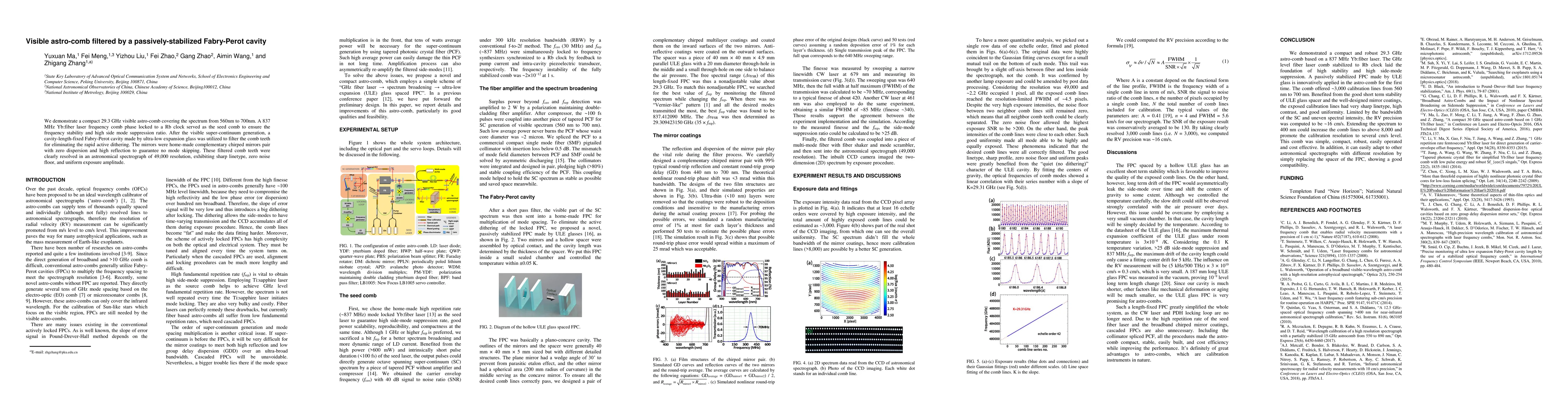 We demonstrate a compact 29.3 GHz visible astro-comb covering the spectrum from 560nm to 700nm. A 837 MHz Yb:fiber laser frequency comb phase locked to a Rb clock served as the seed comb to ensure the frequency stability and high side mode suppression ratio. After the visible super-continuum generation, a cavity-length-fixed Fabry-Perot cavity made by ultra-low expansion glass was utilized to filter the comb teeth for eliminating the rapid active dithering. The mirrors were home-made complementary chirped mirrors pair with zero dispersion and high reflection to guarantee no mode skipping. These filtered comb teeth were clearly resolved in an astronomical spectrograph of 49,000 resolution, exhibiting sharp linetype, zero noise floor, and uniform exposure amplitude.