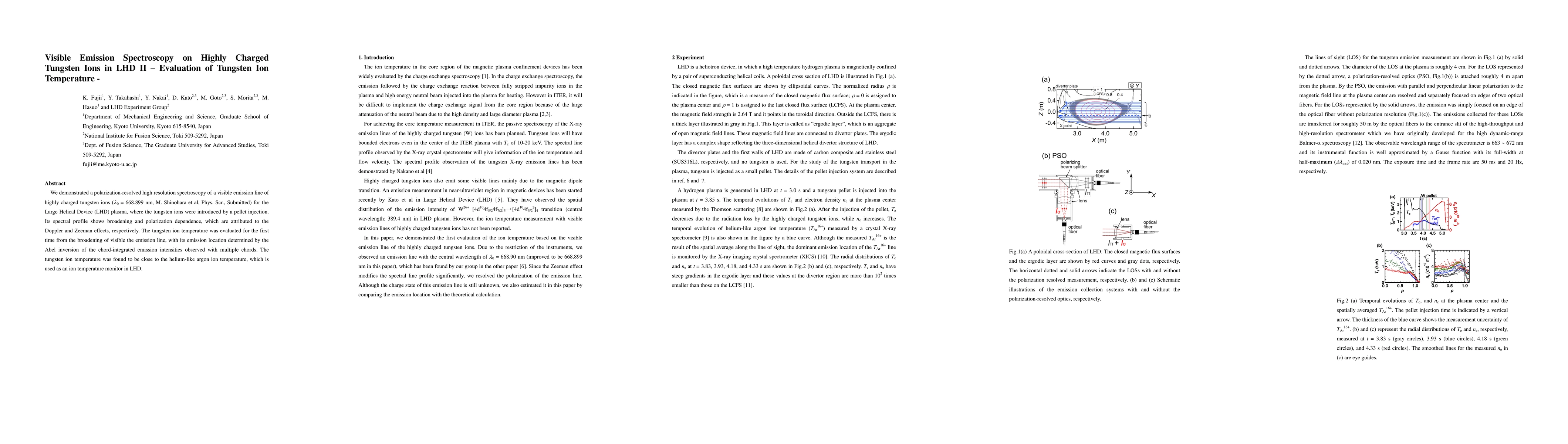 This study employs polarization-resolved high-resolution spectroscopy to analyze visible emission lines from highly charged tungsten ions in LHD plasma, revealing temperature evaluation through spectral line broadening. The tungsten ion temperature was found to closely match that of helium-like argon ions used as a monitor in LHD.