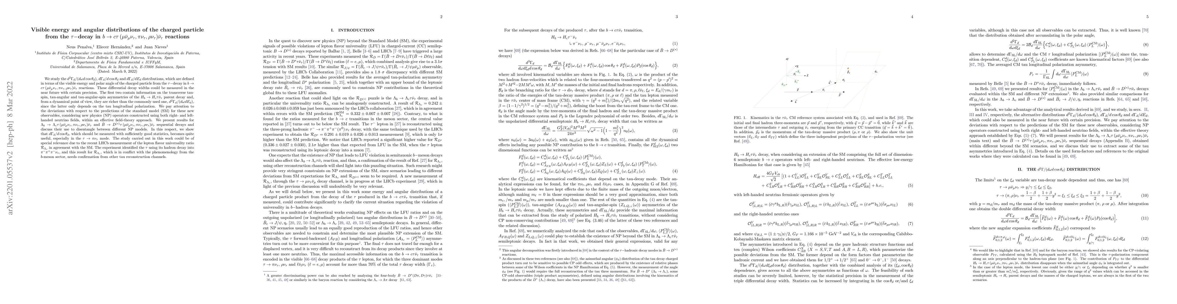 We study the $d^2 \Gamma_d /(d\omega d\cos\theta_d) $, $d\Gamma_d /d\cos\theta_d$ and $ d\Gamma_d /dE_d $ distributions, which are defined in terms of the visible energy and polar angle of the charged particle from the $\tau-$decay in $b\to c \tau\, (\mu \bar \nu_\mu \nu_\tau,\pi \nu_\tau,\rho\nu_\tau) \bar\nu_\tau$ reactions. The first two contain information on the transverse tau-spin, tau-angular and tau-angular-spin asymmetries of the $H_b\to H_c\tau\bar\nu_\tau$ parent decay and, from a dynamical point of view, they are richer than the commonly used one, $d^2 \Gamma_d /(d\omega dE_d) $, since the latter only depends on the tau longitudinal polarization. We pay attention to the deviations with respect to the predictions of the standard model (SM) for these new observables, considering new physics (NP) operators constructed using both right- and left-handed neutrino fields, within an effective field-theory approach. We present results for $\Lambda_b\to\Lambda_c\tau\, (\mu \bar \nu_\mu \nu_\tau,\pi\nu_\tau,\rho\nu_\tau)\bar\nu_\tau$ and $\bar B \to D^{(*)}\tau\, (\mu \bar \nu_\mu \nu_\tau,\pi\nu_\tau,\rho\nu_\tau) \bar\nu_\tau$ sequential decays and discuss their use to disentangle between different NP models. In this respect, we show that $d\Gamma_d /d\cos\theta_d$, which should be measured with sufficiently good statistics, becomes quite useful, especially in the $\tau\to \pi \nu_\tau$ mode. The study carried out in this work could be of special relevance due to the recent LHCb measurement of the lepton flavor universality ratio ${\cal R}_{\Lambda_c}$ in agreement with the SM. The experiment identified the $\tau$ using its hadron decay into $\pi^-\pi^+\pi^-\nu_\tau$, and this result for ${\cal R}_{\Lambda_c}$, which is in conflict with the phenomenology from the $b$-meson sector, needs confirmation from other tau reconstruction channels.