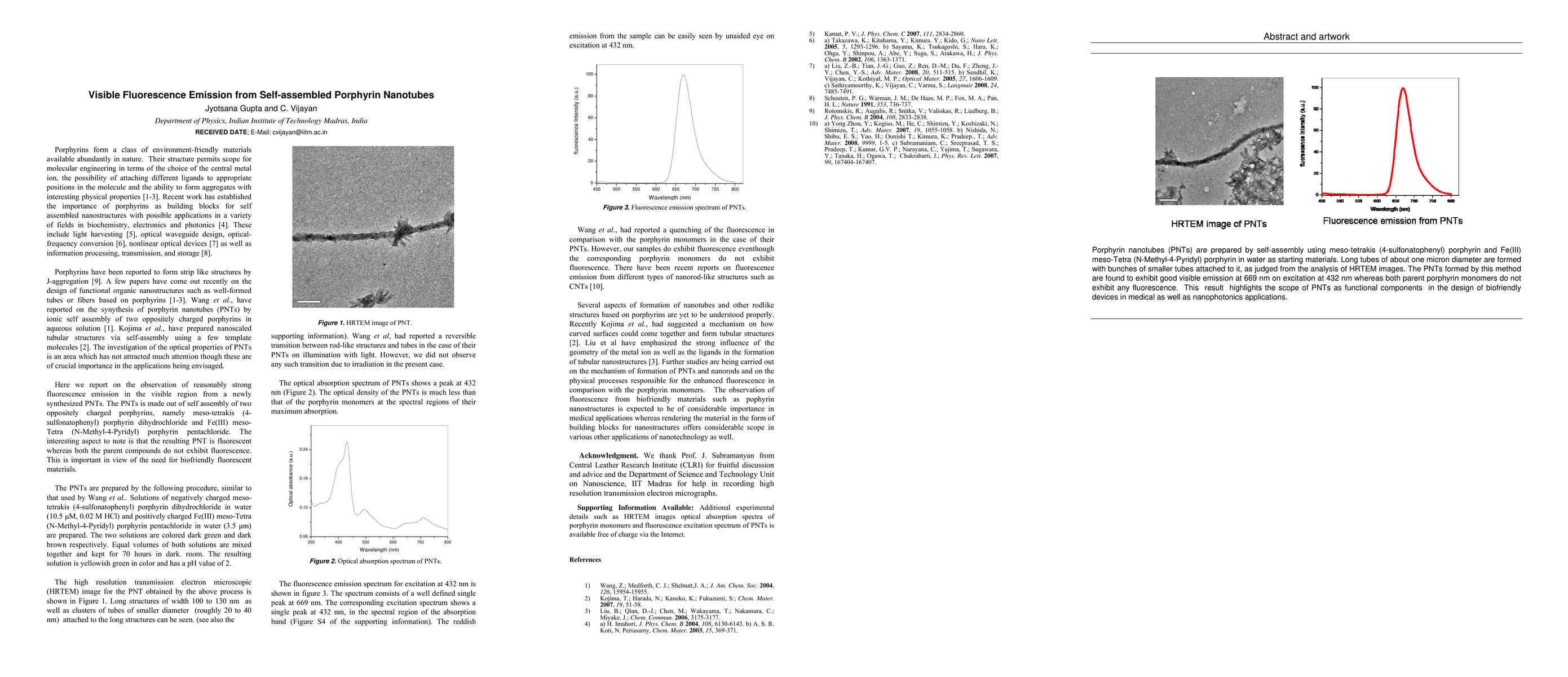 This paper reports the self-assembly of porphyrin nanotubes (PNTs) using specific porphyrin monomers in water, resulting in tubes with visible fluorescence emission at 669 nm, a property not exhibited by the individual monomers. The findings suggest potential applications of PNTs in biofriendly medical and nanophotonics devices.